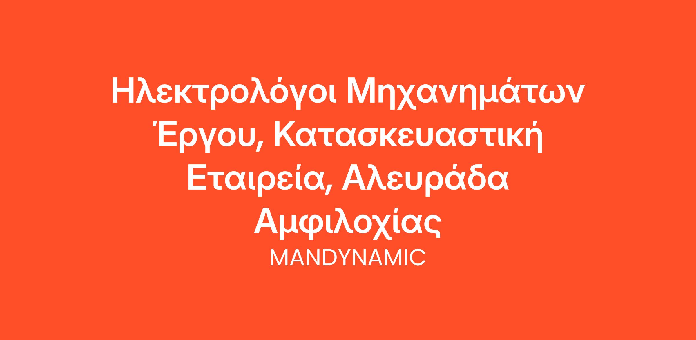 Η MANDYNAMIC αναζητά ηλεκτρολόγοι μηχανημάτων έργου για λογαριασμό πολυεθνικής κατασκευαστικής εταιρείας, στην Αλευράδα Αμφιλοχίας.