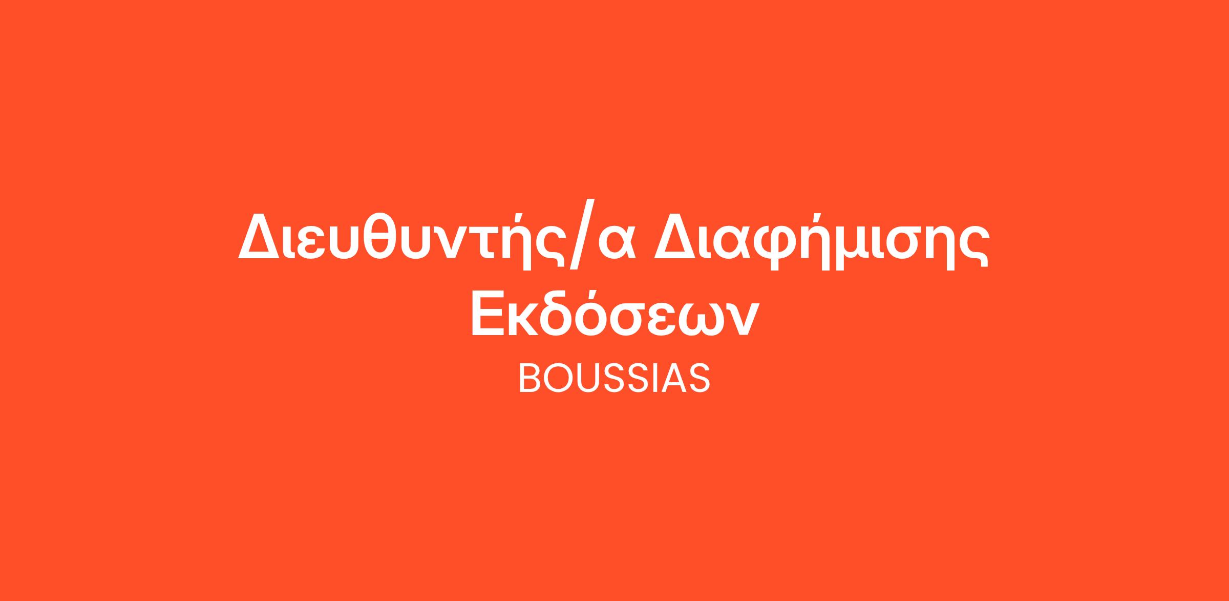 Η εταιρεία BOUSSIAS Media αναζητά Διευθυντή/α Διαφήμισης Εκδόσεων, υπεύθυνο/η της ομάδας διαφημιστικού χώρου για 10 περιοδικά και 9 newsletters. Ο υποψήφιος/α θα ηγείται της ομάδας πωλήσεων, θα αναπτύσσει στρατηγικές για νέες συνεργασίες, θα διασφαλίζει την ικανοποίηση των πελατών και τη μέγιστη απόδοση ανά προϊόν.