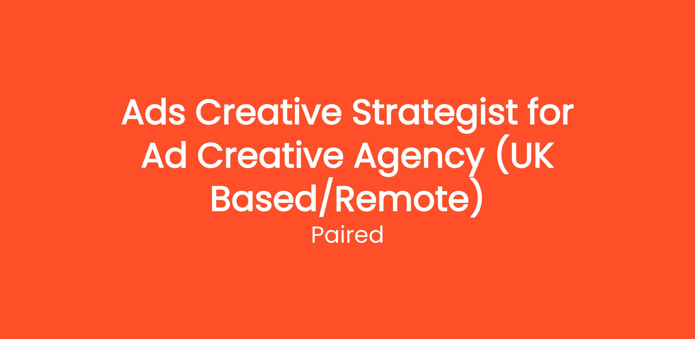 We are currently partnering with an innovative Ad Creative Agency that seeks an Ads Creative Strategist to join their dynamic team. This role offers opportunities to work with a diverse range of clients, crafting impactful advertising content that drives engagement and conversion.