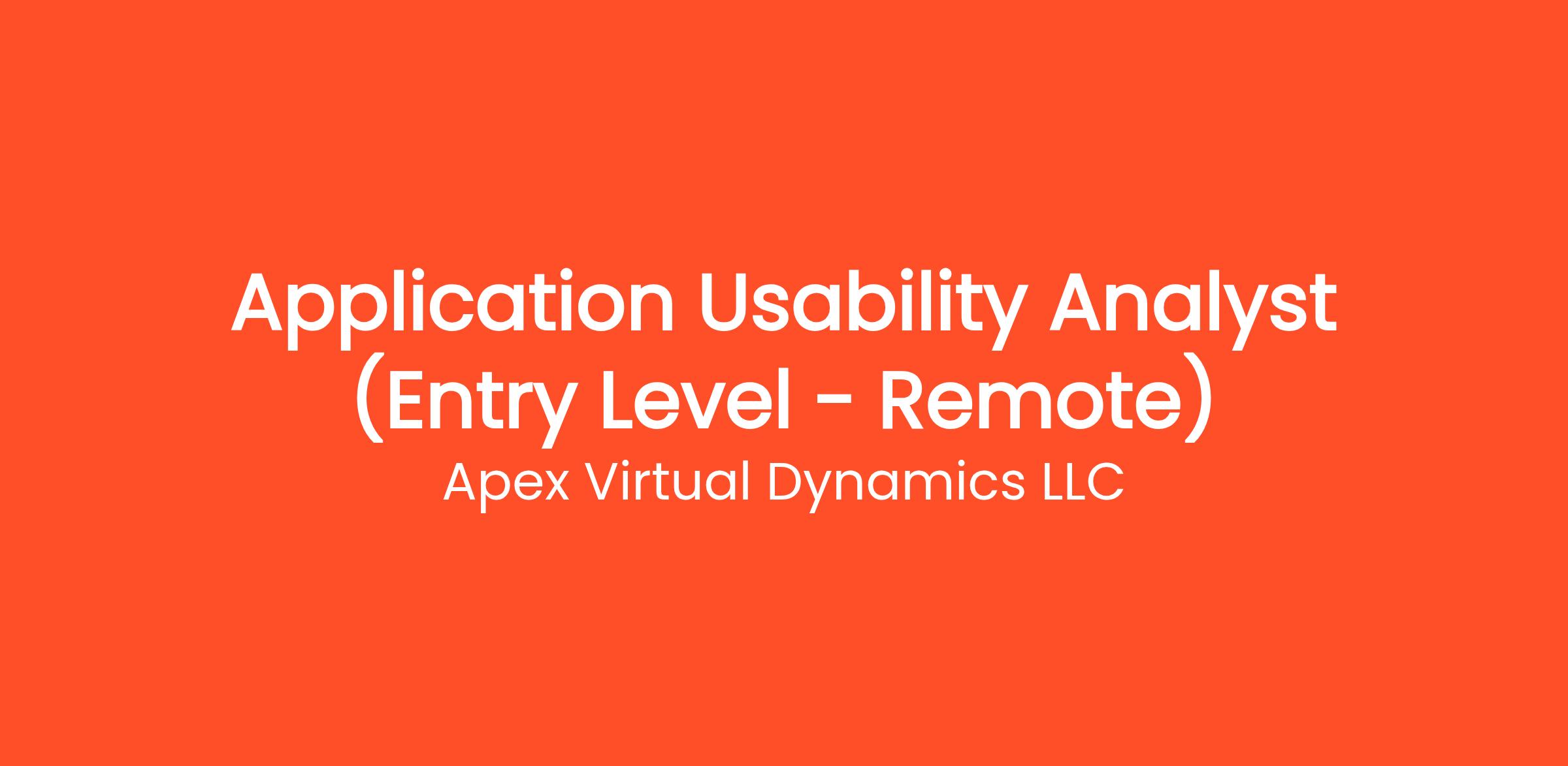 Are you highly organized and looking for the perfect entry-level opportunity? Apex Virtual Dynamics LLC is currently seeking a Application Usability Analyst (Entry Level - Remote) to join our rapidly growing remote team. If you've been searching for remote jobs no degree or overnight remote jobs, this is the exact role you've been looking for. No degree required and no prior experience is necessary—we provide comprehensive training to all new hires! You will be responsible for critical daily operations, managing secure platforms, and contributing to our vibrant digital culture.