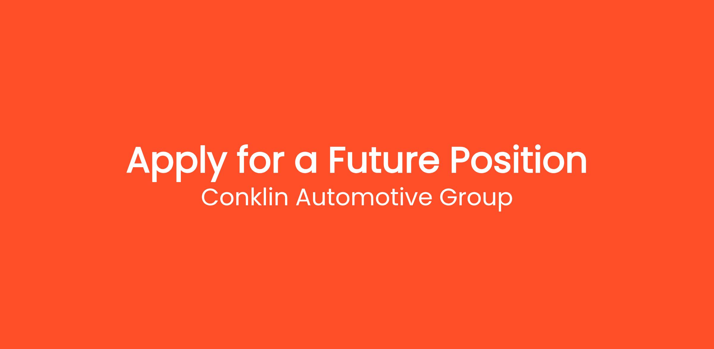 At Conklin Automotive Group, we value talent and ambition, even when a specific position is not currently available. We invite you to apply for future opportunities within our dynamic team. Whether you are passionate about automotive sales, service, or support roles, we are always looking for talented individuals who are dedicated to delivering exceptional customer experiences and contributing to our company culture.