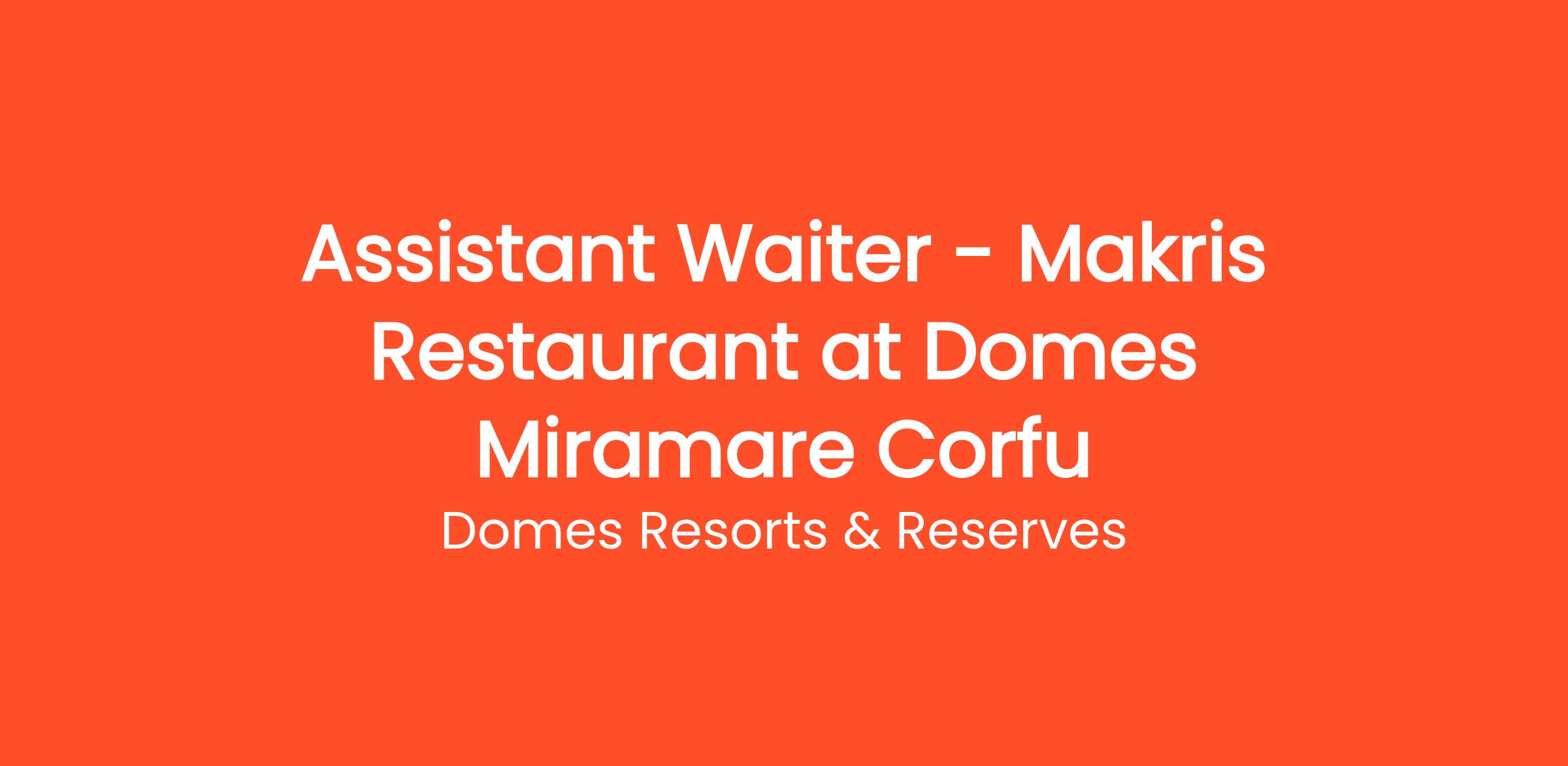 Αυτή την στιγμή προσλαμβάνουμε για το 5* ξενοδοχείο Domes Miramare Corfu που εδρεύει στη Κέρκυρα, Assistant Waiter/Βοηθό Σερβιτόρου για να γίνει μέλος της ομάδας του MAKRIS Restaurant at Corfu.