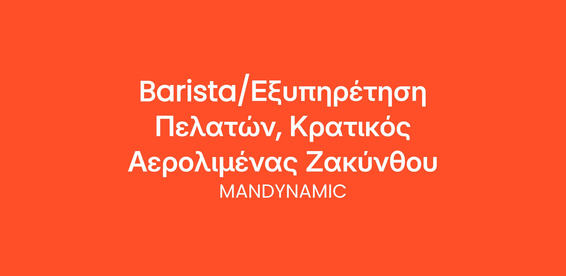 Η MANDYNAMIC αναζητά Barista εκ μέρους καταστήματος εστίασης στον Κρατικό Αερολιμένα Ζακύνθου. Οι υποψήφιοι θα πρέπει να διαθέτουν γνώσεις σε ανάλογη θέση με συνεκτιμώμενη την θετική διάθεση, την υπευθυνότητα και τον επαγγελματισμό.