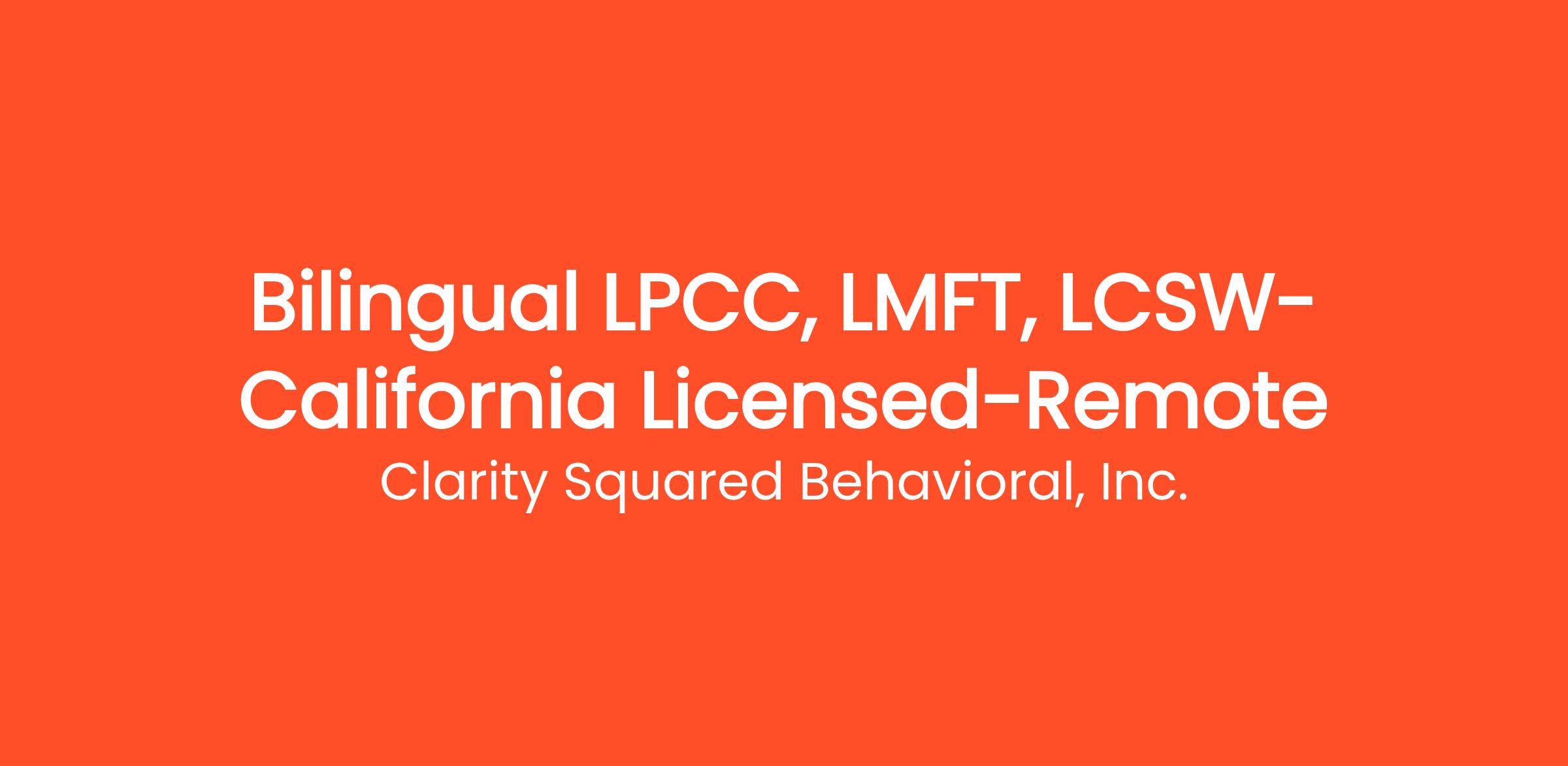 Clarity Squared Behavioral, Inc. is seeking a dedicated and compassionate Bilingual (Spanish-English) Licensed Professional Clinical Counselor (LPCC), Licensed Marriage and Family Therapist (LMFT) or Licensed Clinical Social Worker (LCSW) with active California licensure to join our clinical team in a remote, part-time capacity to start. As a psychotherapist, you will provide therapy via telehealth focusing on underserved populations including Workers Comp patients, veterans, surgical patients, seniors and others. This role offers the flexibility of working from home while making a meaningful impact in the lives of clients. The ability to go full time is rapidly available as you gain comfort with our system. With a meaningful commitment to California's Hispanic community, we offer our services in both Spanish and English.