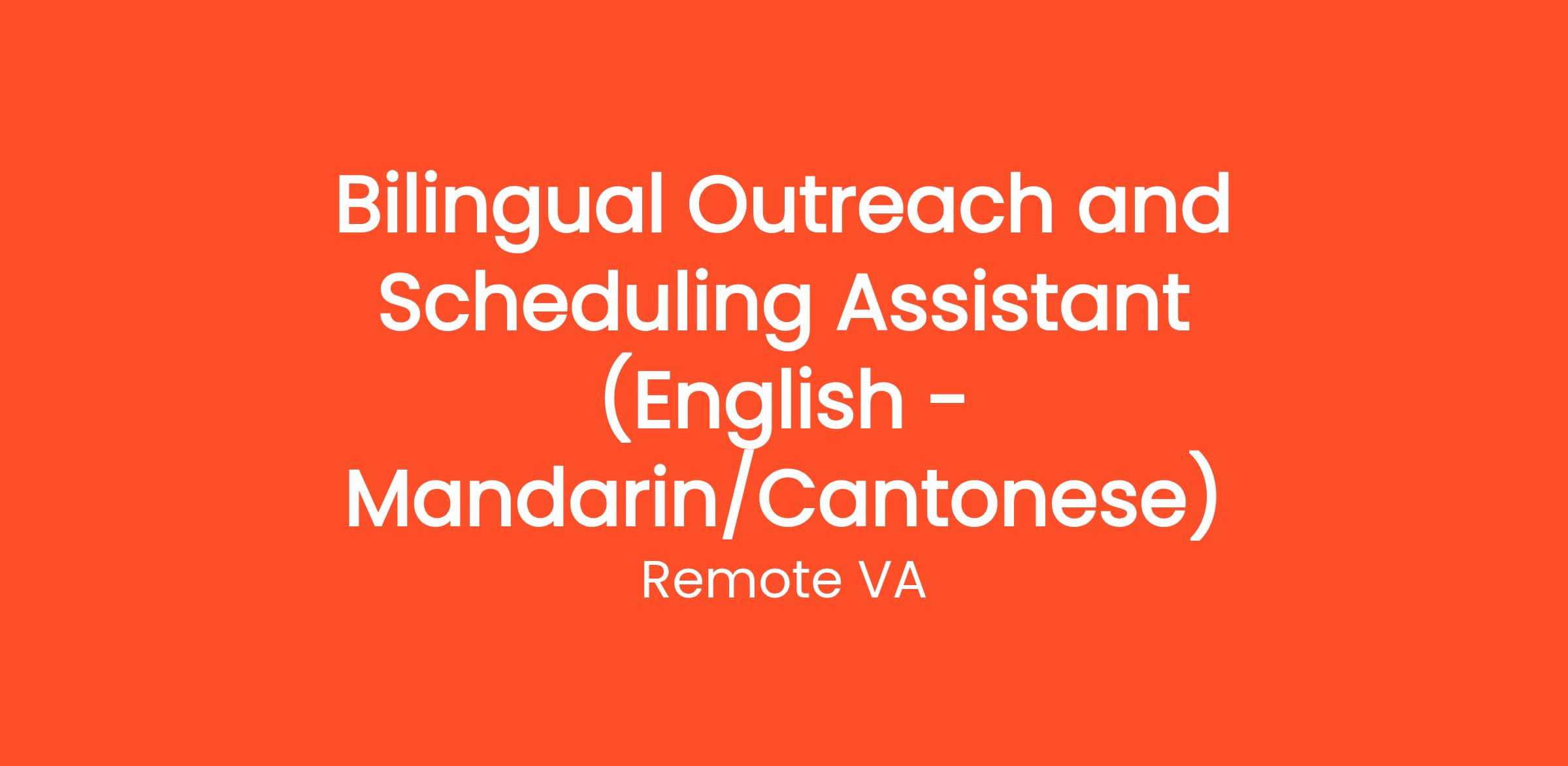 Job Description: We are looking for a skilled and organized Bilingual Outreach and Scheduling Assistant proficient in English, Mandarin and Cantonese. This role involves conducting outreach, managing schedules, inputting information into our systems, and providing translation services during appointments. The ideal candidate will have excellent communication skills, a high level of proficiency in both languages, and the ability to manage multiple tasks effectively.