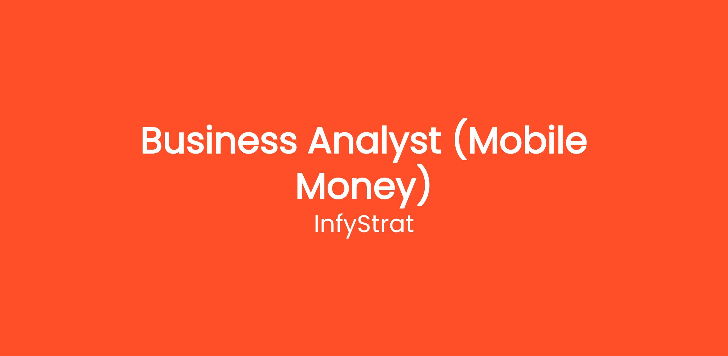 InfyStrat is seeking a talented Business Analyst with a focus on Mobile Money to join our innovative team. In this role, you will be responsible for analyzing market trends, user requirements, and business processes related to our mobile payment solutions. You will work closely with cross-functional teams, including product development, marketing, and customer support, to enhance our offerings and ensure they meet the needs of our clients and users. The ideal candidate will have strong analytical skills, a passion for mobile technology, and an understanding of the financial services industry. At InfyStrat, we are committed to delivering cutting-edge solutions and enhancing user experience, and you will play a crucial role in driving our initiatives forward. If you are looking for an opportunity to leverage your skills in a dynamic environment and contribute to the growth of mobile money solutions, we encourage you to apply.