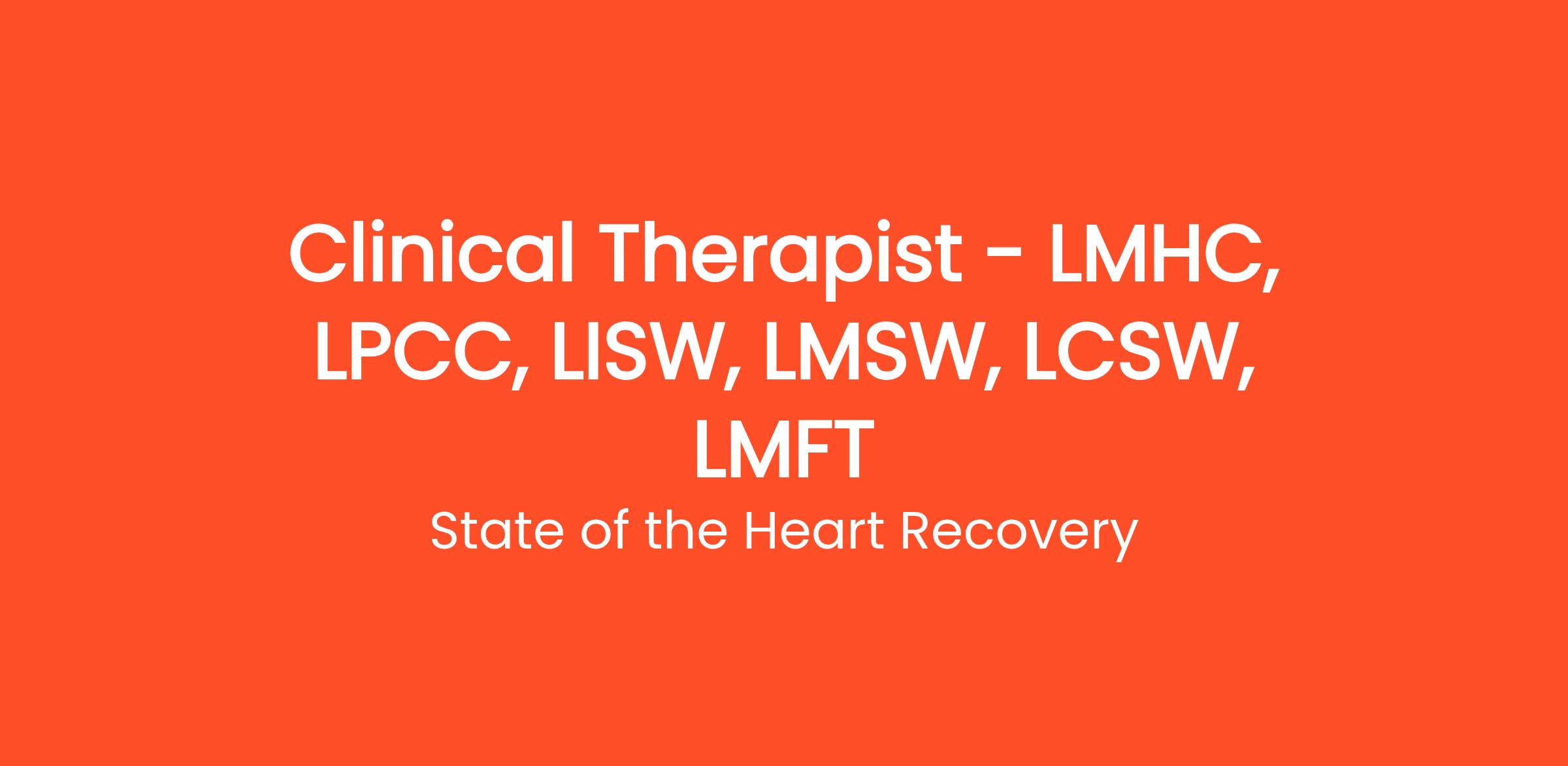 State of the Heart Recovery is seeking a Clinical Therapist to deliver high-quality behavioral health and substance use counseling services within an integrated treatment environment. This role provides individual, group, and family therapy, conducts clinical assessments, develops treatment plans, and ensures compliance with ethical and regulatory standards. The Clinical Therapist works under supervision as required by licensure and contributes to a collaborative, trauma-informed clinical team.