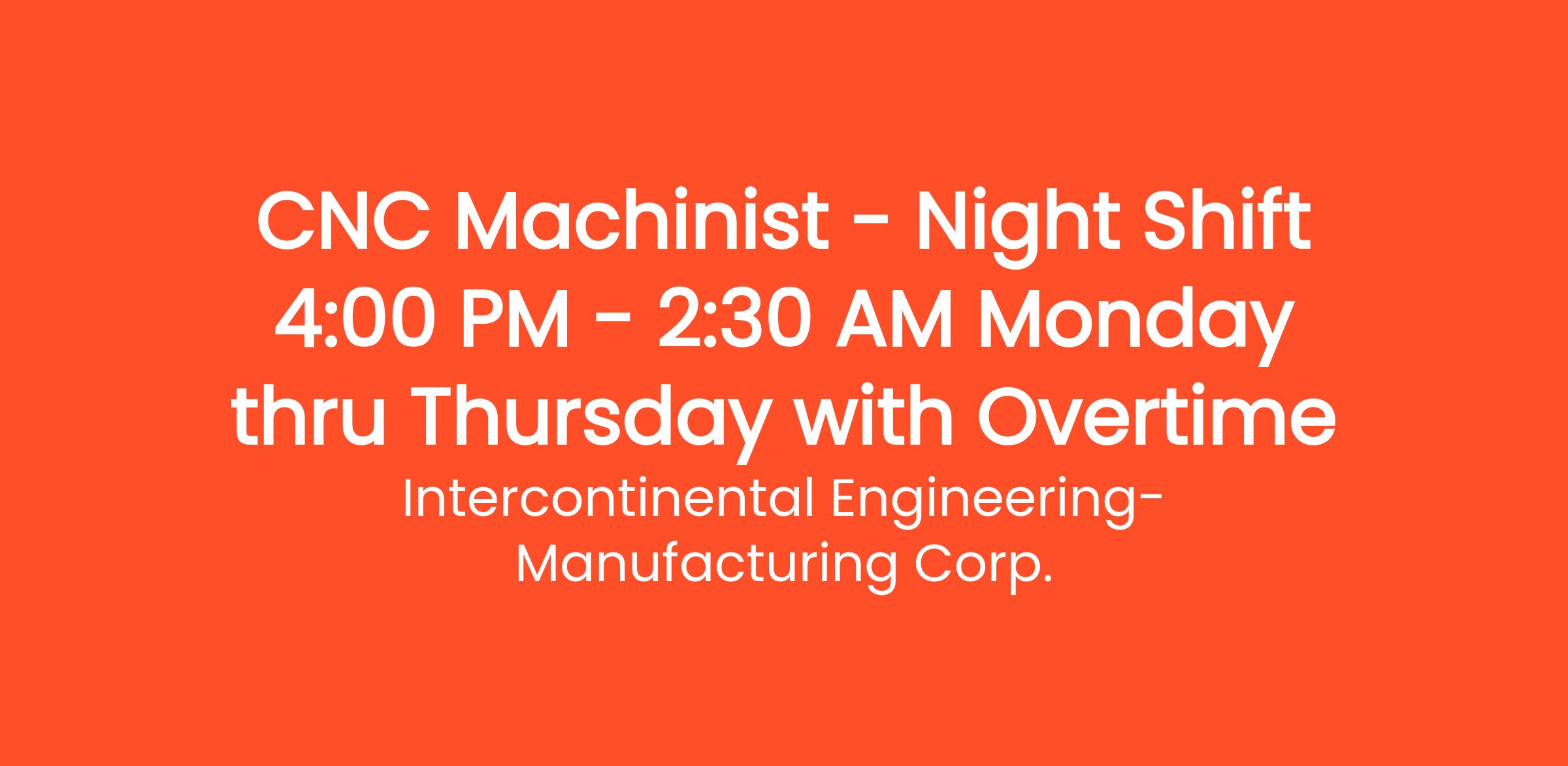 Intercontinental Engineering – Manufacturing Corporation is an equal opportunity employer committed to recruit, hire, train, and promote in all job categories without regard to race, color, religion, sex, sexual orientation, gender identity, national origin, age, disability, veteran status or other status protected by applicable law.