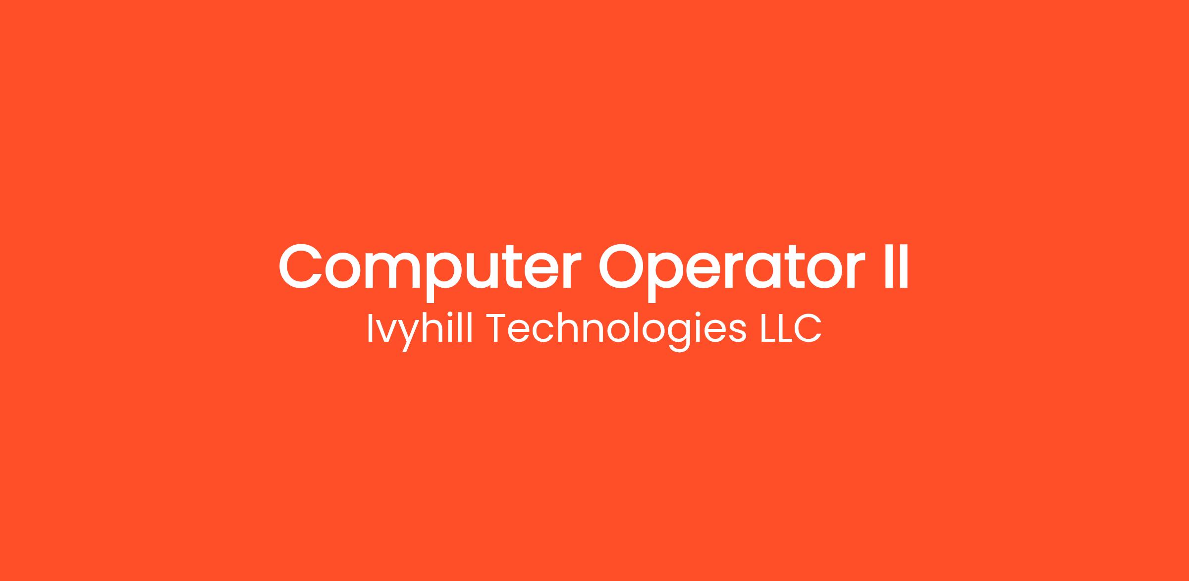 Ivyhill has an immediate need for a Computer Operator II that will support our their FDA CDER DCC project in Rockville, MD. The Computer Operator II (CO2) will process scheduled routines that present few difficult operating problems (e.g., infrequent or easily resolved error conditions). In response to computer output instructions or error conditions, the CO2 applies standard operating or corrective procedures, refers problems that do not respond to pre-planned procedures, and may serve as an assistant operator, working under general supervision.