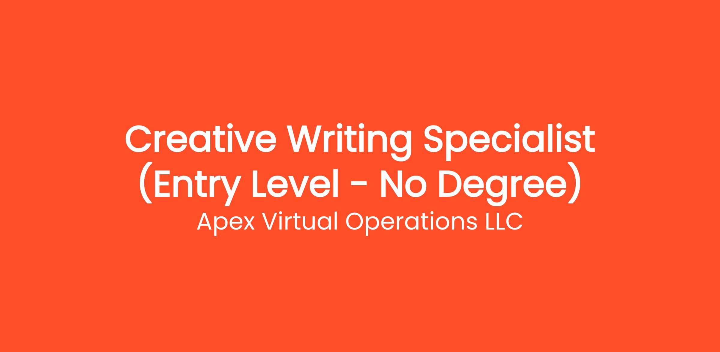Are you highly organized and looking for the perfect entry-level opportunity? Apex Virtual Operations LLC is currently seeking a Creative Writing Specialist (Entry Level - No Degree) to join our rapidly growing remote team. If you've been searching for remote jobs no degree or remote jobs no experience, this is the exact role you've been looking for. No degree required and no prior experience is necessary—we provide comprehensive training to all new hires! You will be responsible for critical daily operations, managing secure platforms, and contributing to our vibrant digital culture.