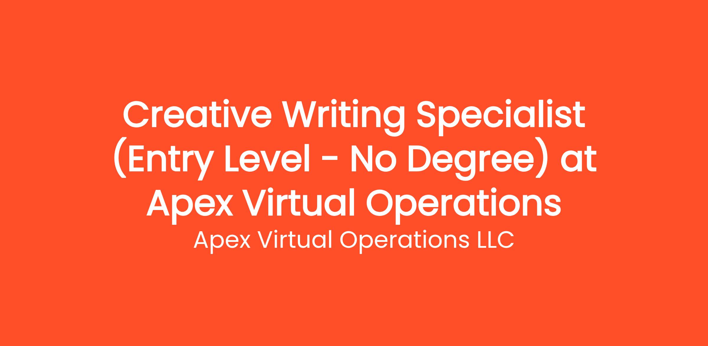 Are you highly organized and looking for the perfect entry-level opportunity? Apex Virtual Operations LLC is currently seeking a Creative Writing Specialist (Entry Level - No Degree) to join our rapidly growing remote team. If you've been searching for remote jobs no degree or remote jobs no experience, this is the exact role you've been looking for. No degree required and no prior experience is necessary—we provide comprehensive training to all new hires! You will be responsible for critical daily operations, managing secure platforms, and contributing to our vibrant digital culture.