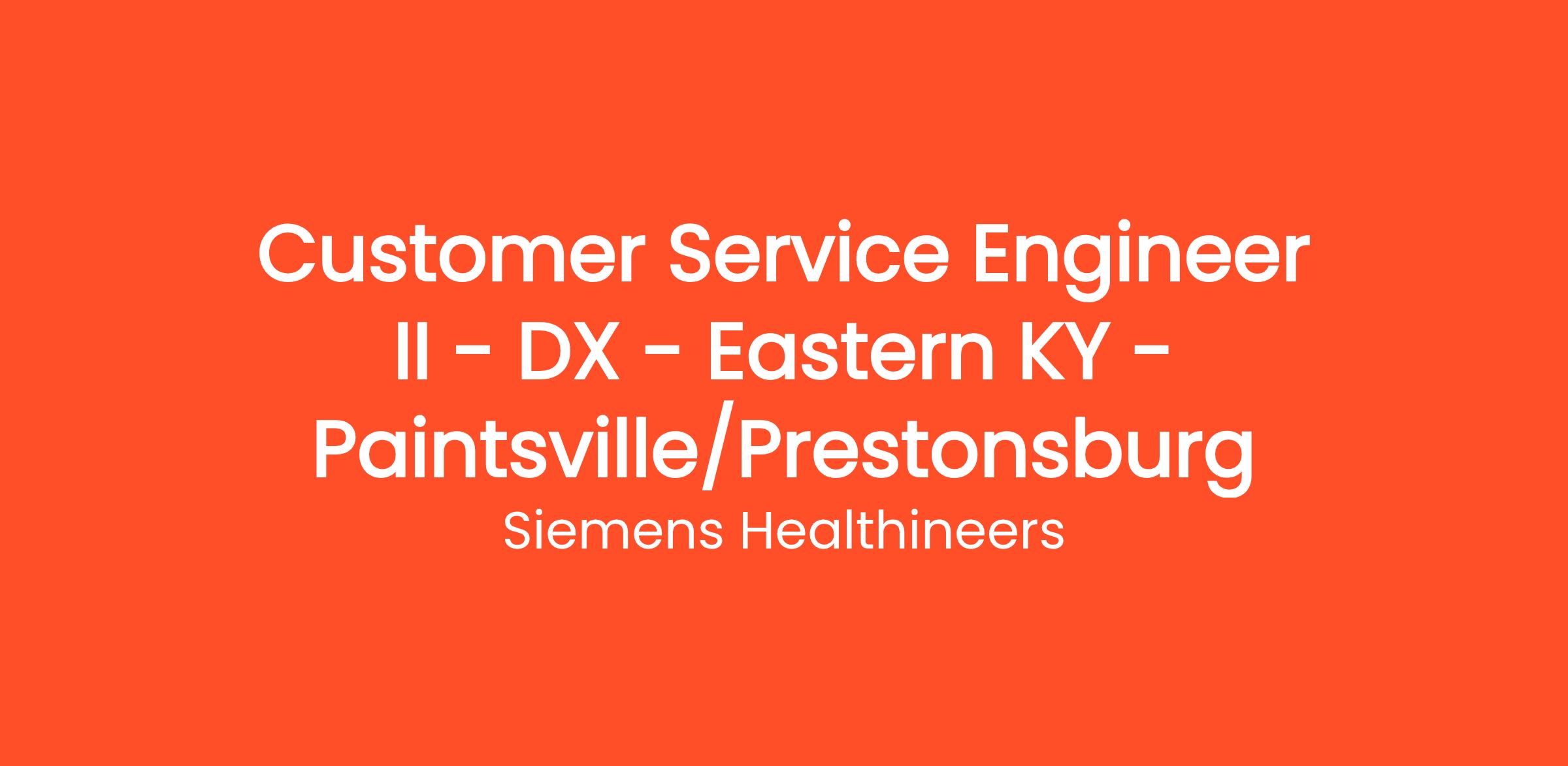 You will be servicing Diagnostic Equipment in the Eastern, KY - Paintsville/Prestonsburg area. Customer Service Engineer Level based on prior experience.