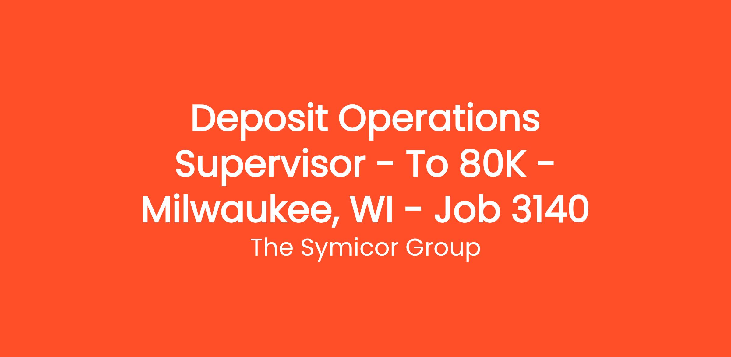 Deposit Operations Supervisor – To $80K – Milwaukee, WI – Job # 3140