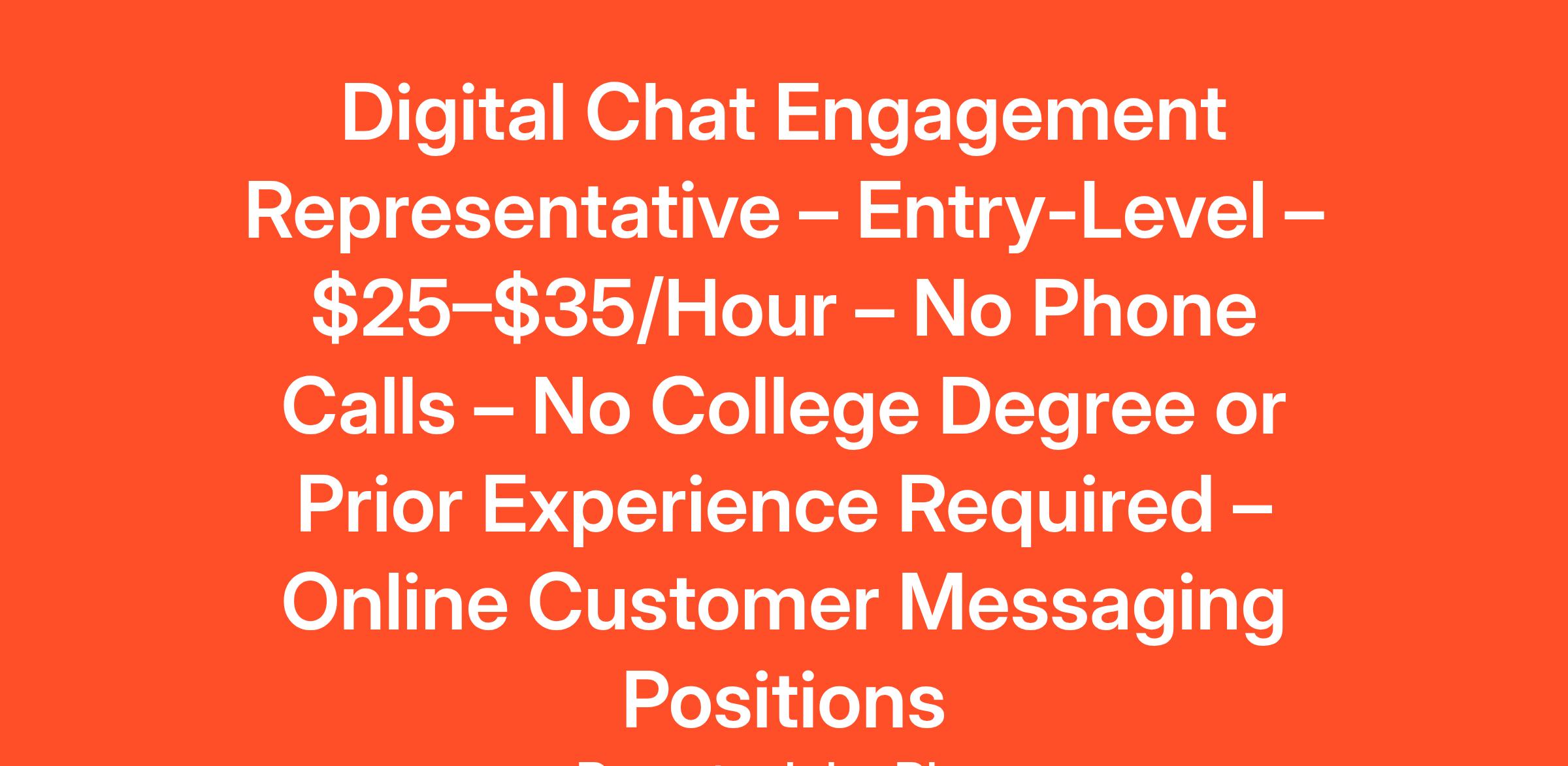 Role OverviewA leading customer experience agency is hiring Virtual Chat Engagement Representatives to join its fully remote support team. This is an entry-level, non-phone role offering competitive pay of $25–$35 per hour. No degree or prior customer service experience is needed. All training is paid, and work is conducted entirely through digital messaging—meaning no video meetings, no calls, and no face-to-face interactions. If you're looking to start a remote career from anywhere in the world, this position offers real pay, flexibility, and upward mobility.