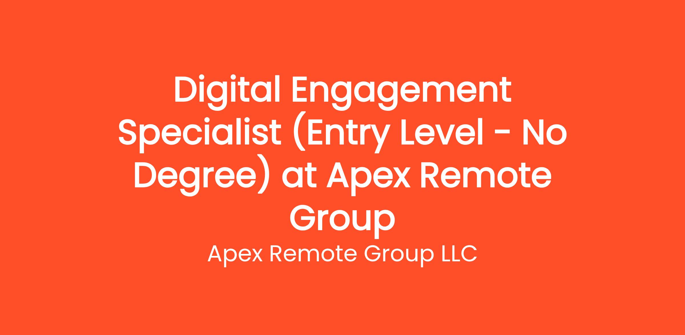 Are you highly organized and looking for the perfect entry-level opportunity? Apex Remote Group LLC is currently seeking a Digital Engagement Specialist (Entry Level - No Degree) to join our rapidly growing remote team. If you've been searching for remote jobs no degree or remote jobs hiring, this is the exact role you've been looking for. No degree required and no prior experience is necessary—we provide comprehensive training to all new hires! You will be responsible for critical daily operations, managing secure platforms, and contributing to our vibrant digital culture.