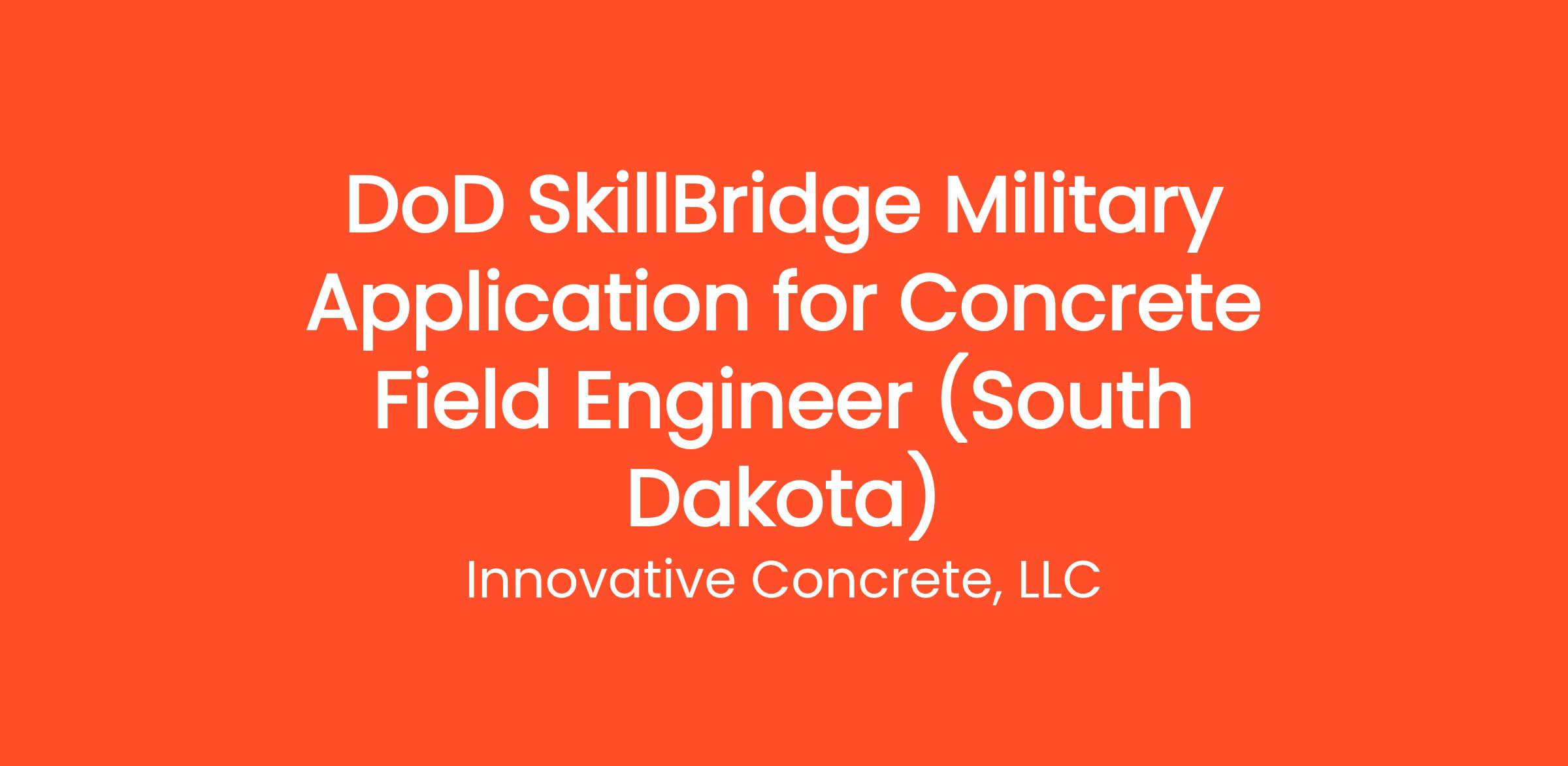Innovative Concrete, LLC is excited to announce a unique opportunity for military personnel transitioning to civilian life through the DoD SkillBridge program as a Commercial Concrete Field Engineer in South Dakota. This position allows candidates to leverage their military training and experience to gain valuable skills in the concrete and construction industry while supporting our Innovative projects.