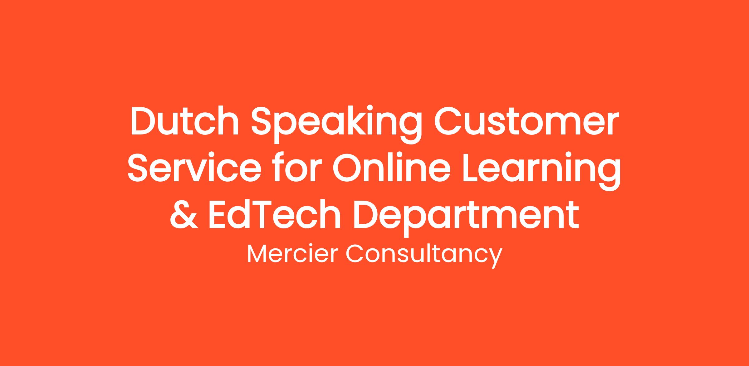 Mercier Consultancy is seeking a Dutch Speaking Customer Service Representative to join our Client's Online Learning & EdTech Department. In this impactful Junior role, you will provide outstanding support to our Dutch-speaking customers, helping them navigate our online education platforms and enhancing their learning experiences.