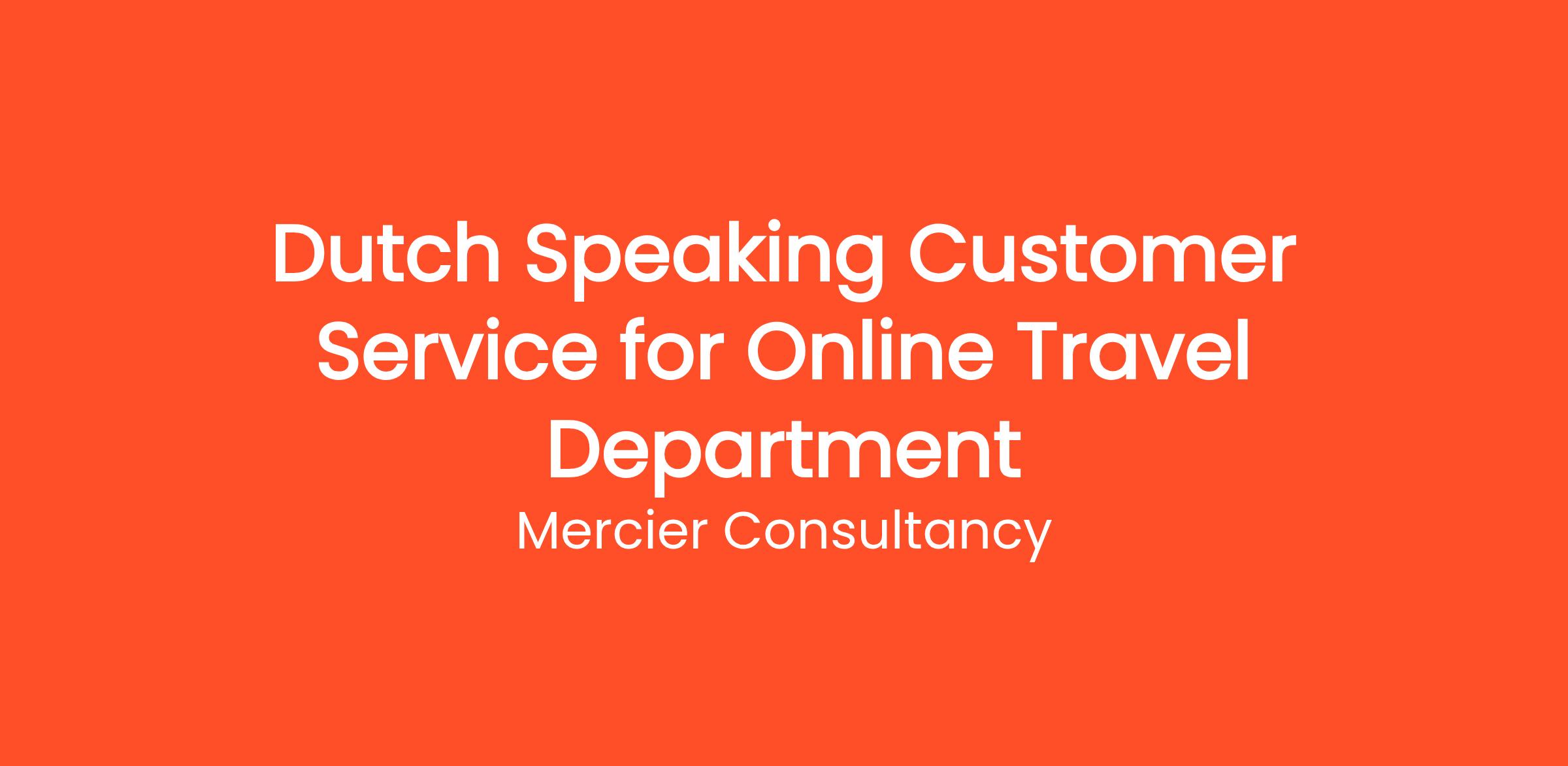 Mercier Consultancy is on the lookout for a Dutch Speaking Customer Service Representative to join our Online Travel Department. In this engaging role, you will provide exceptional support to our Dutch-speaking clients, assisting them with their travel inquiries and ensuring a hassle-free booking experience.