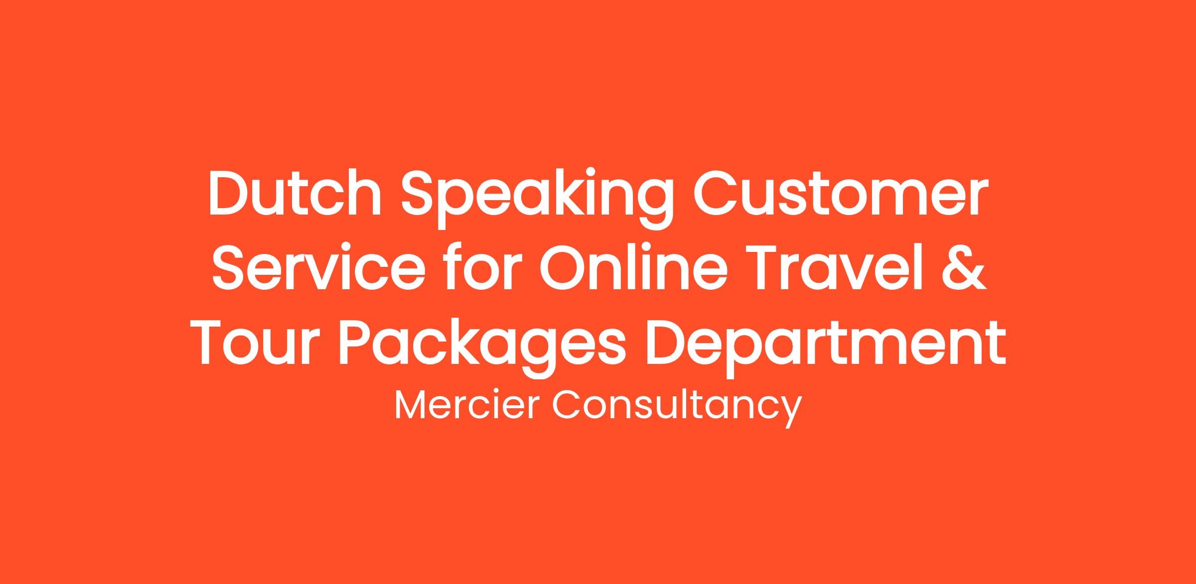 Mercier Consultancy is seeking a passionate Dutch Speaking Customer Service Representative to join our Online Travel & Tour Packages Department. In this pivotal role, you will provide exceptional support to our Dutch-speaking customers, helping them plan and book their dream travel experiences through our comprehensive tour packages.