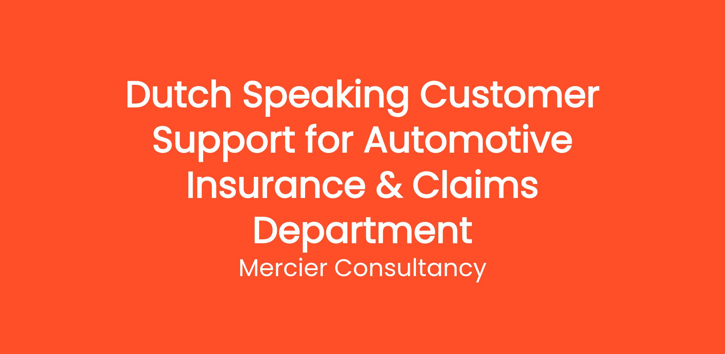 Mercier Consultancy is seeking a Dutch Speaking Customer Support Representative for our Automotive Insurance & Claims Department! In this essential role, you will assist our Dutch-speaking clients with their inquiries related to automotive insurance and claims processing. Your expertise and customer-focused approach will be key in ensuring that our clients receive the highest level of service as they navigate their insurance needs.
