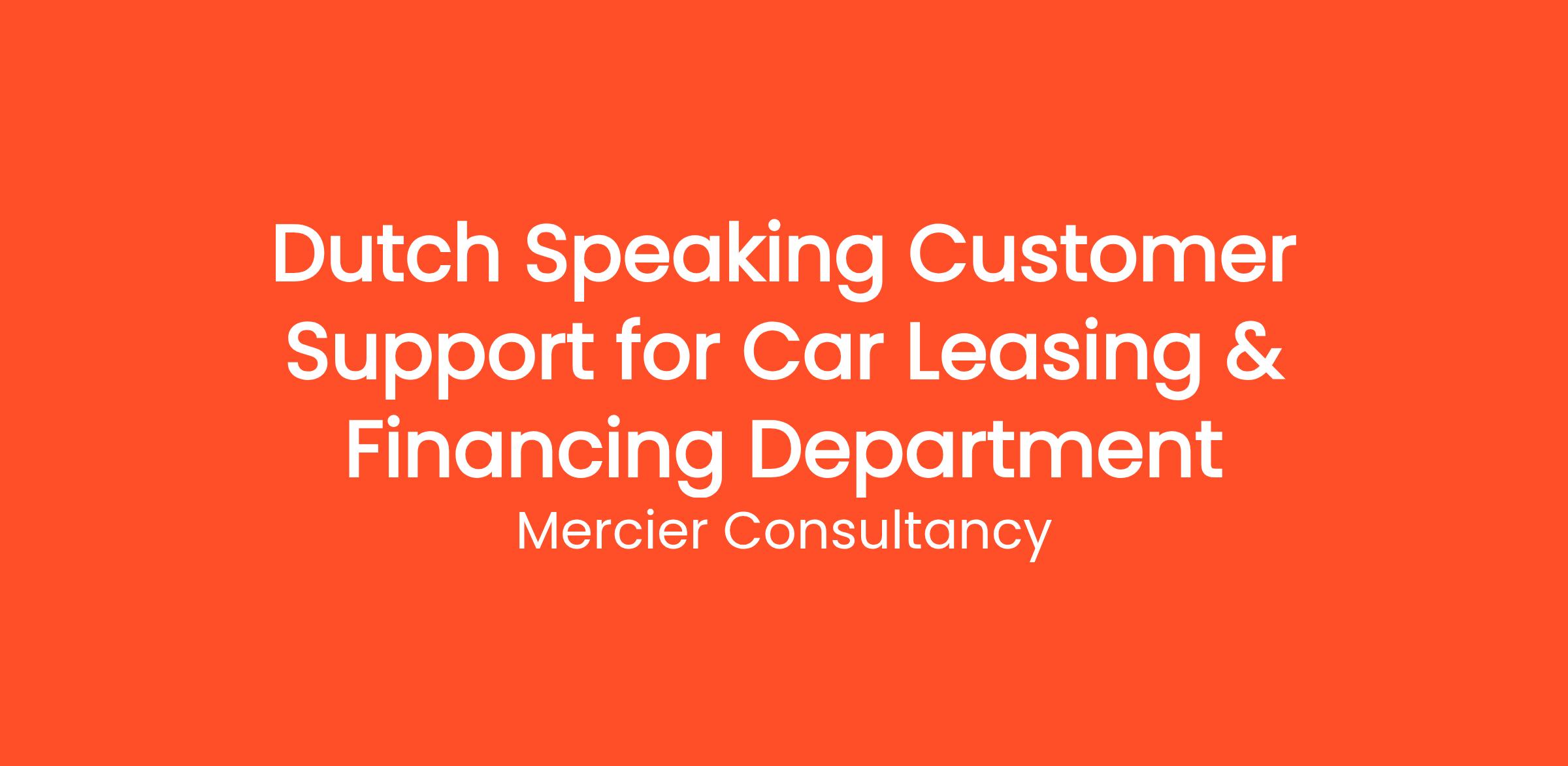 Mercier Consultancy is excited to announce a vacancy for a Dutch Speaking Customer Support Representative in our Car Leasing & Financing Department! In this essential role, you will provide exceptional service to our Dutch-speaking clients who are navigating the world of car leasing and financing. Your expertise and support will be crucial in helping them make informed decisions and manage their leasing needs effectively.