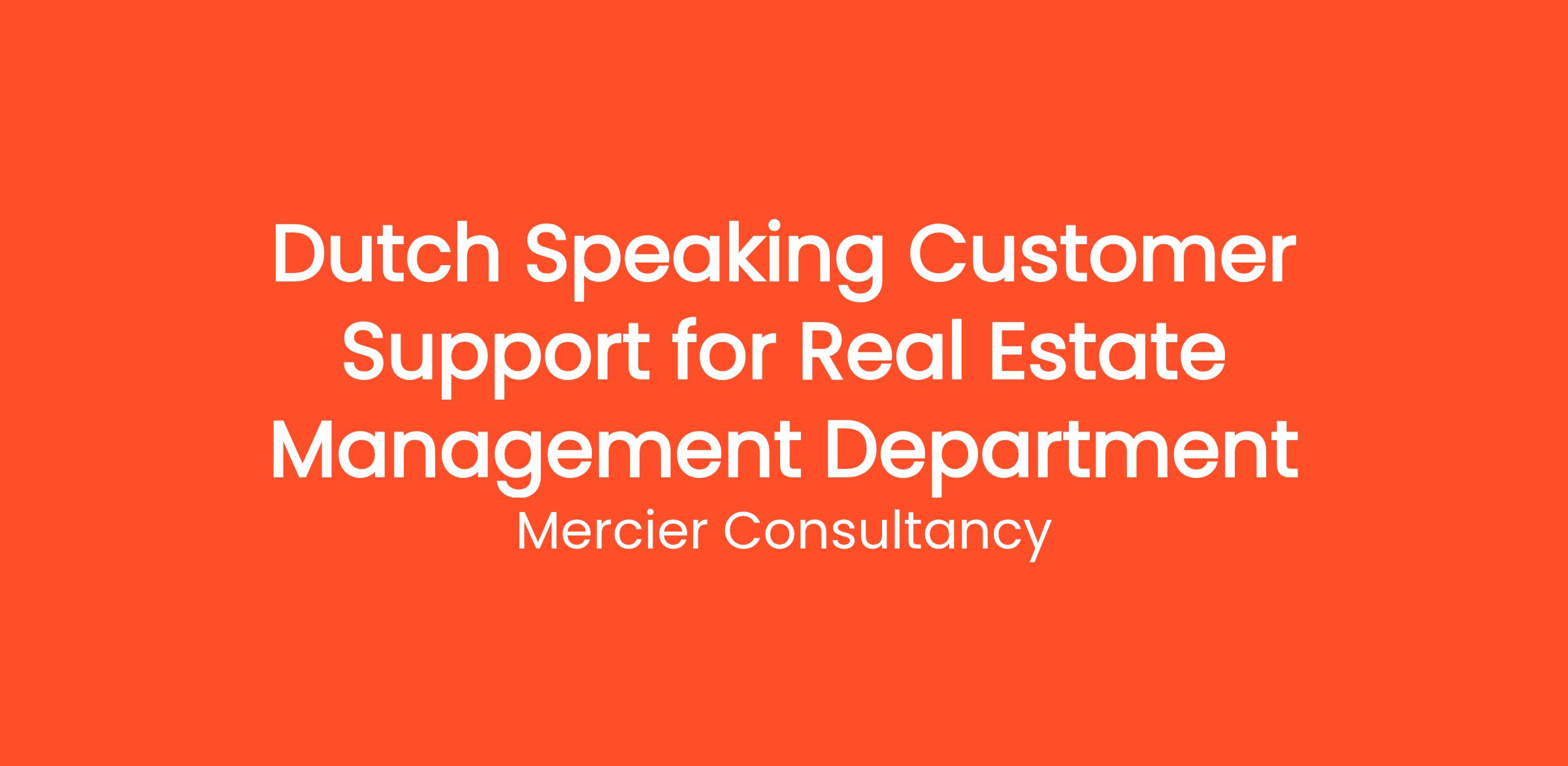 Mercier Consultancy is excited to announce an opening for a Dutch Speaking Customer Support Representative in our Real Estate Management Department! In this important role, you will provide exceptional support to our Dutch-speaking clients, helping them navigate various inquiries related to real estate services and management. Your ability to communicate fluently in Dutch will be key in delivering effective and efficient service to our clients.