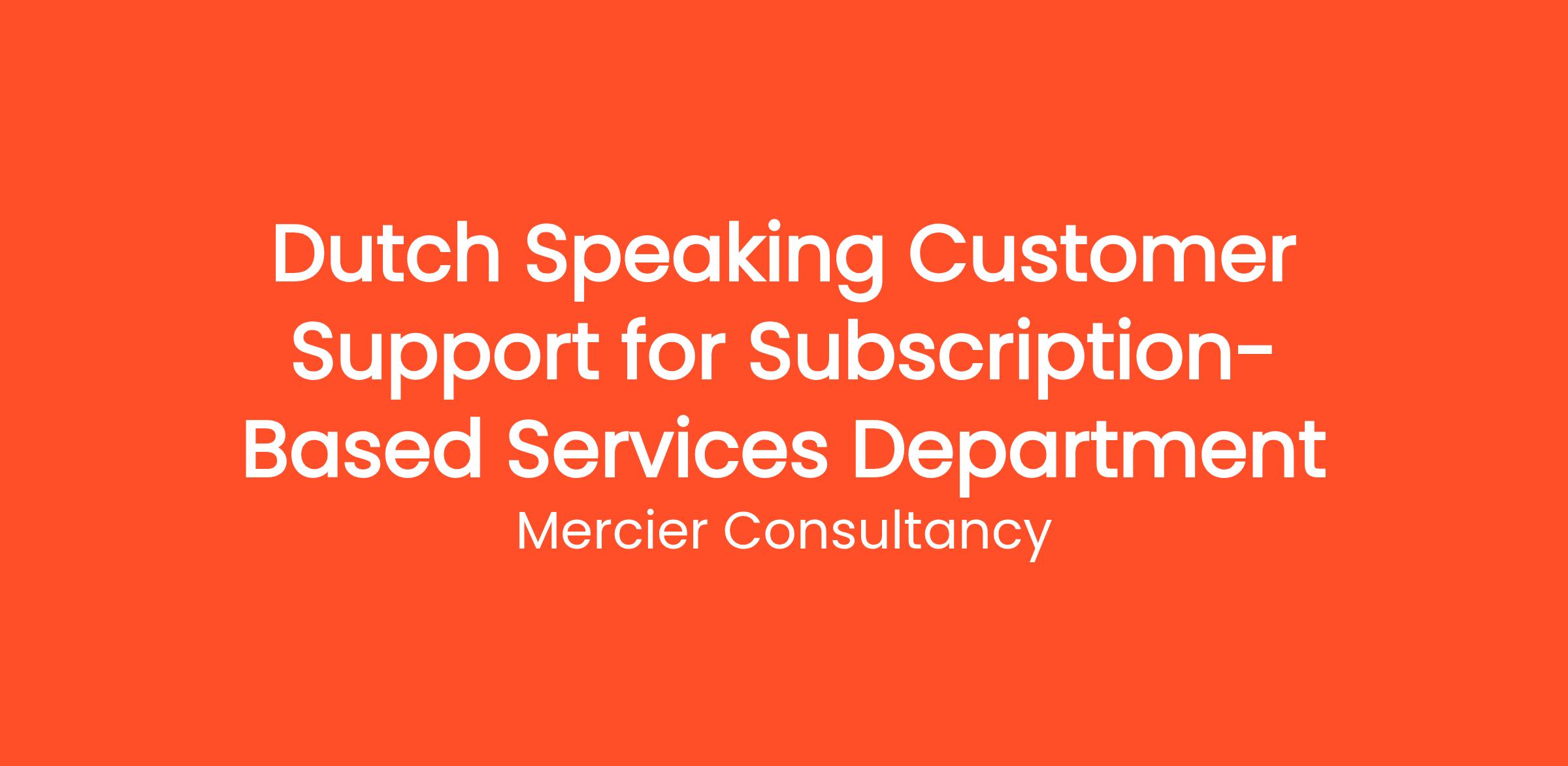 Mercier Consultancy is seeking a dedicated Dutch Speaking Customer Support Representative for our Subscription-Based Services Department! In this essential role, you will assist our Dutch-speaking clients in navigating their subscription services, ensuring they receive excellent support and guidance tailored to their needs. Your expertise will be crucial in enhancing customer satisfaction and retention.