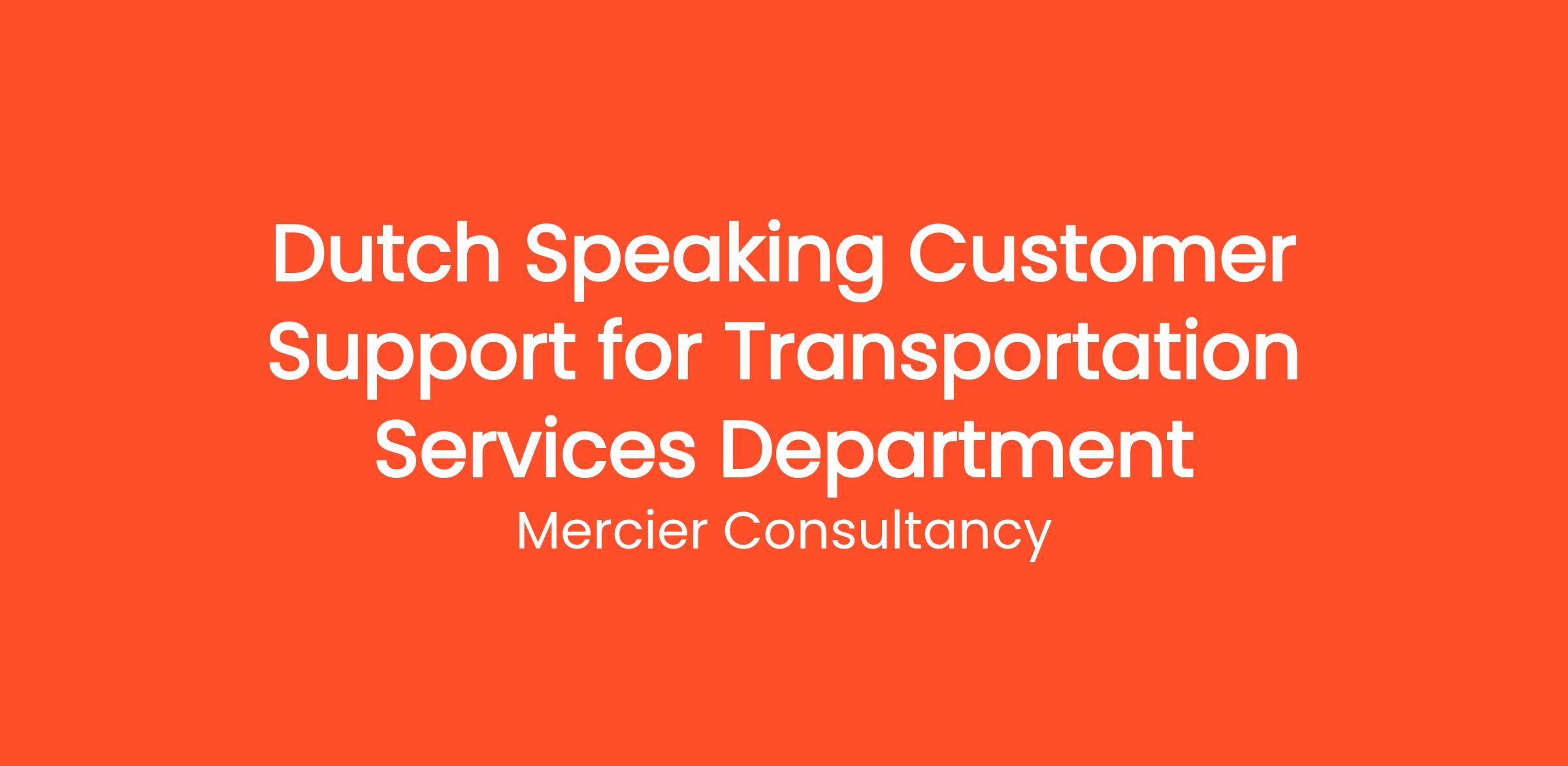 Mercier Consultancy is looking for a Dutch Speaking Customer Support Representative to join our Transportation Services Department! In this important role, you will be the key point of contact for our Dutch-speaking clients, providing them with exceptional support and assistance regarding their transportation needs. Your role will involve ensuring that clients receive timely and accurate information to facilitate their journeys.