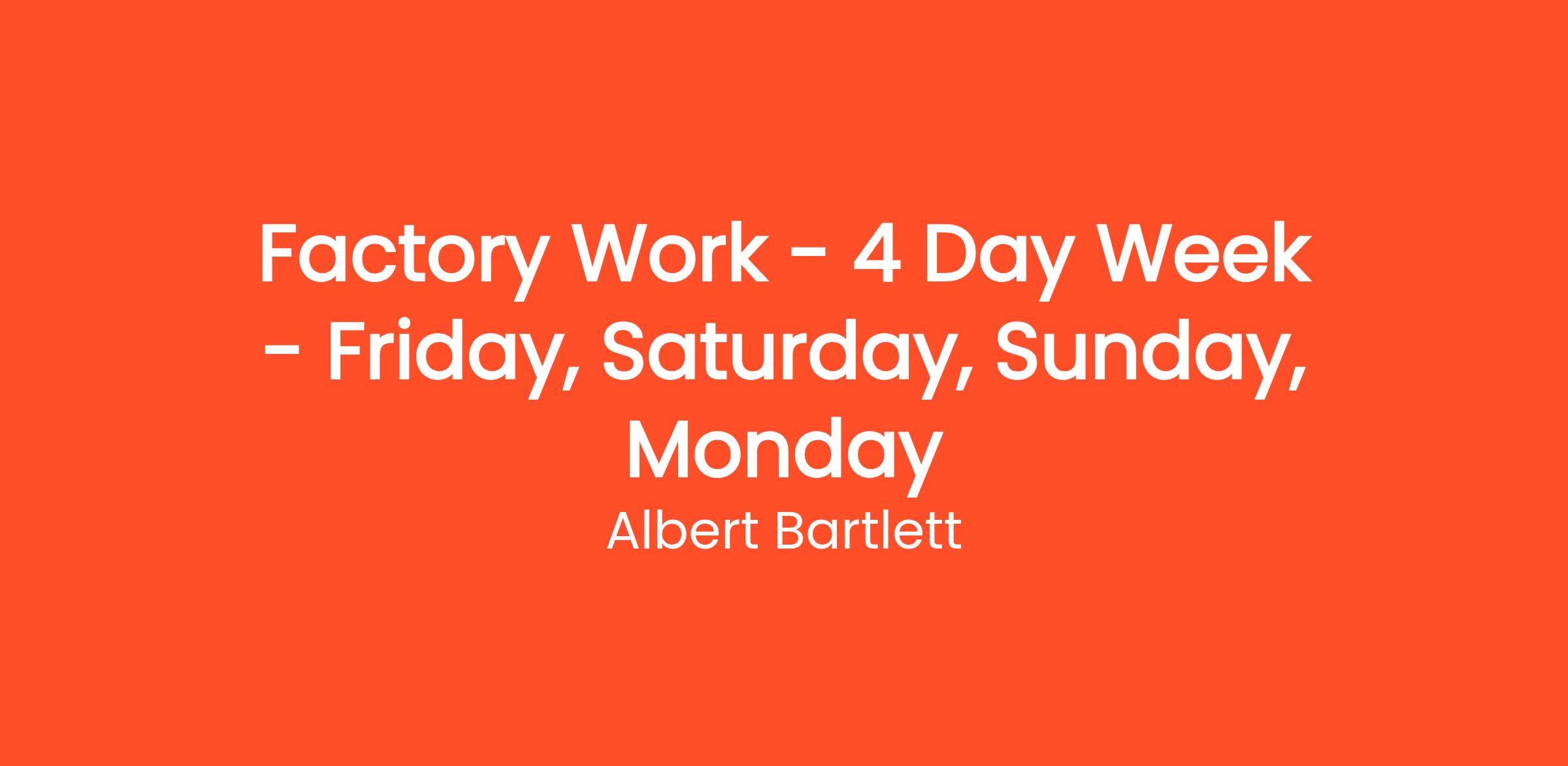 - Hours of Work: Friday & Monday - 0600 to 1430, Saturday & Sunday: 0600 to 1830