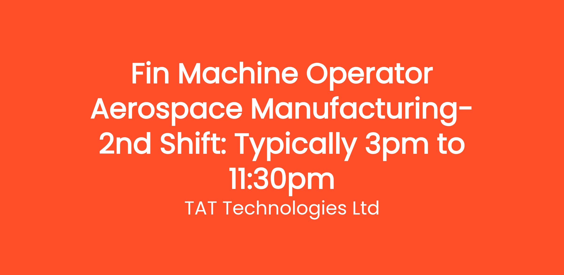 TAT-Technologies Tulsa Site in Tulsa, OK is looking for Fin Machine Operator for our Original Equipment Manufacturing (OEM) operations. This position will work second shift where hours are typically 3pm to 11:30pm wither overtime and weekends as business need demands.