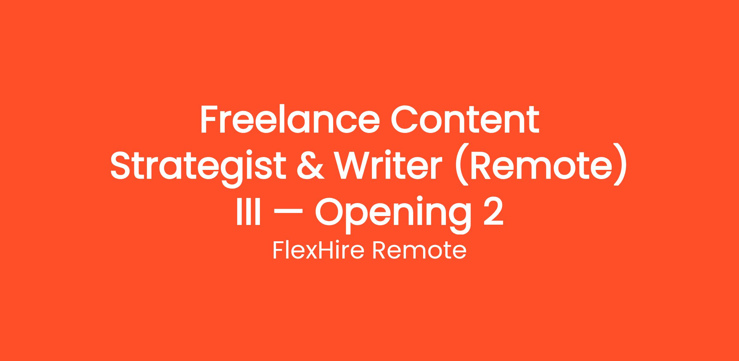 FlexHire Remote is currently looking for motivated individuals to join our team as a Freelance Content Strategist & Writer (Remote) III — Opening 2. Earn money writing articles, blogs, and product descriptions from home. Flexible hours, multiple niches available, weekly pay. This is a fully remote, work-from-home position that can be done from anywhere in the United States. No prior experience is required — just a reliable internet connection and the motivation to learn. Whether you're looking to replace your current income or simply earn extra cash on the side, this flexible opportunity allows you to work as much or as little as you want.
