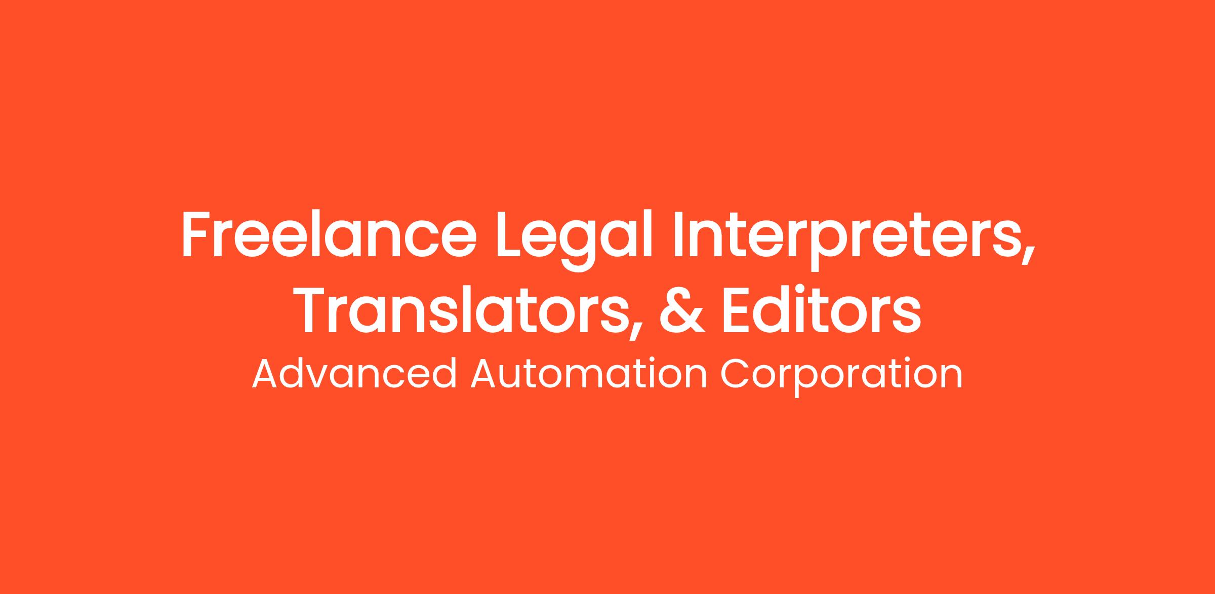 Advanced Automation Corporation (AAC) is seeking freelance Legal Interpreters, Translators, & Editors to support our language services division. As a freelance language professional, you will play a crucial role in providing high-quality interpretation, translation, and editing services in the legal field. This is a remote position that offers flexible hours and competitive compensation. The languages include but are not limited to: