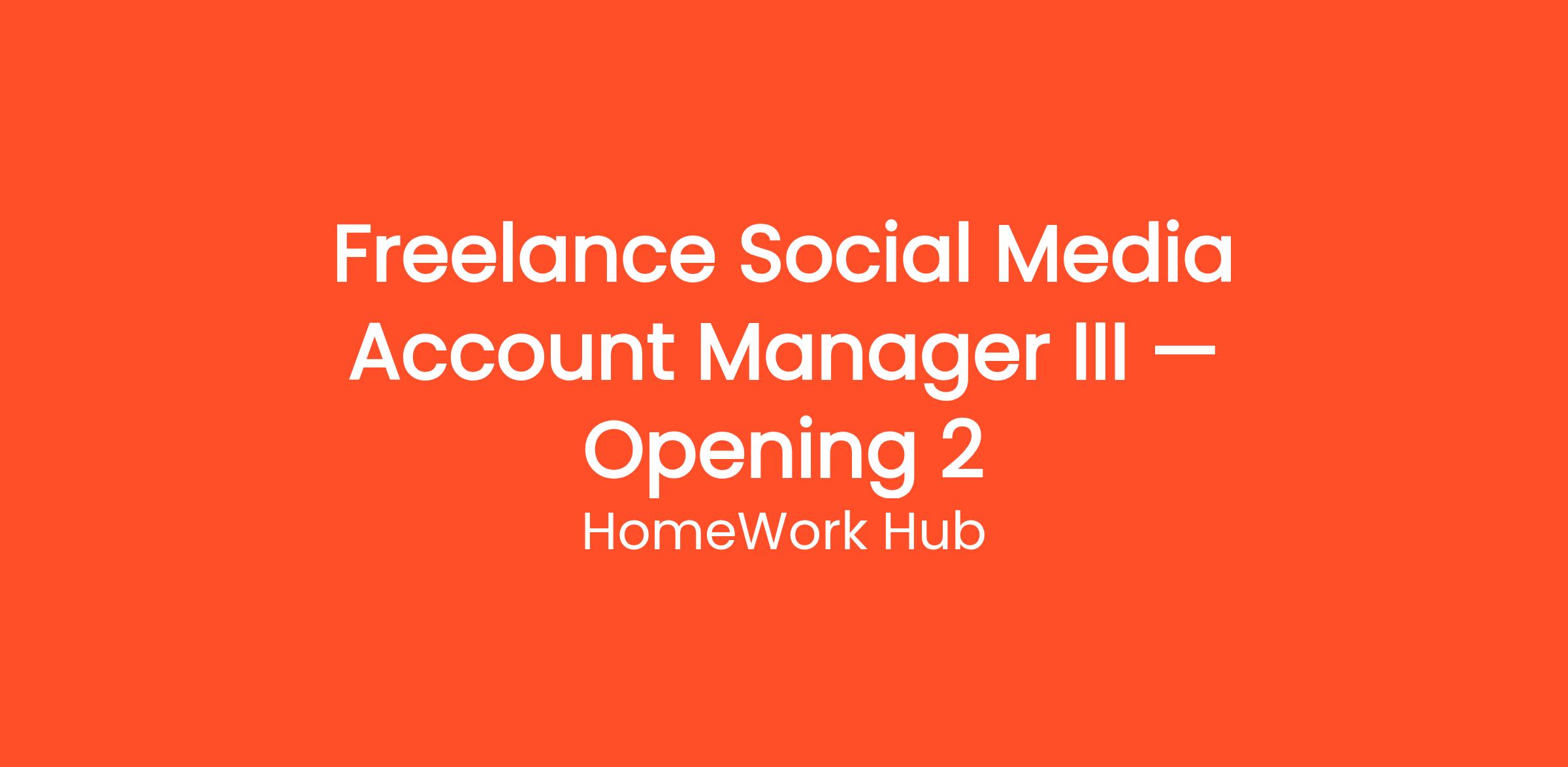 Thousands of people are already working from home as a Freelance Social Media Account Manager III — Opening 2 with HomeWork Hub. Get paid to manage social media accounts from home. Work with brands on Instagram, TikTok, Facebook, and more — no degree required. This work-from-home opportunity requires no commute, no degree, and no special prior experience. Get started on your own terms — choose your own hours and work as many or as few hours per week as you need. Payouts are processed regularly with multiple withdrawal options so you always get paid on time.