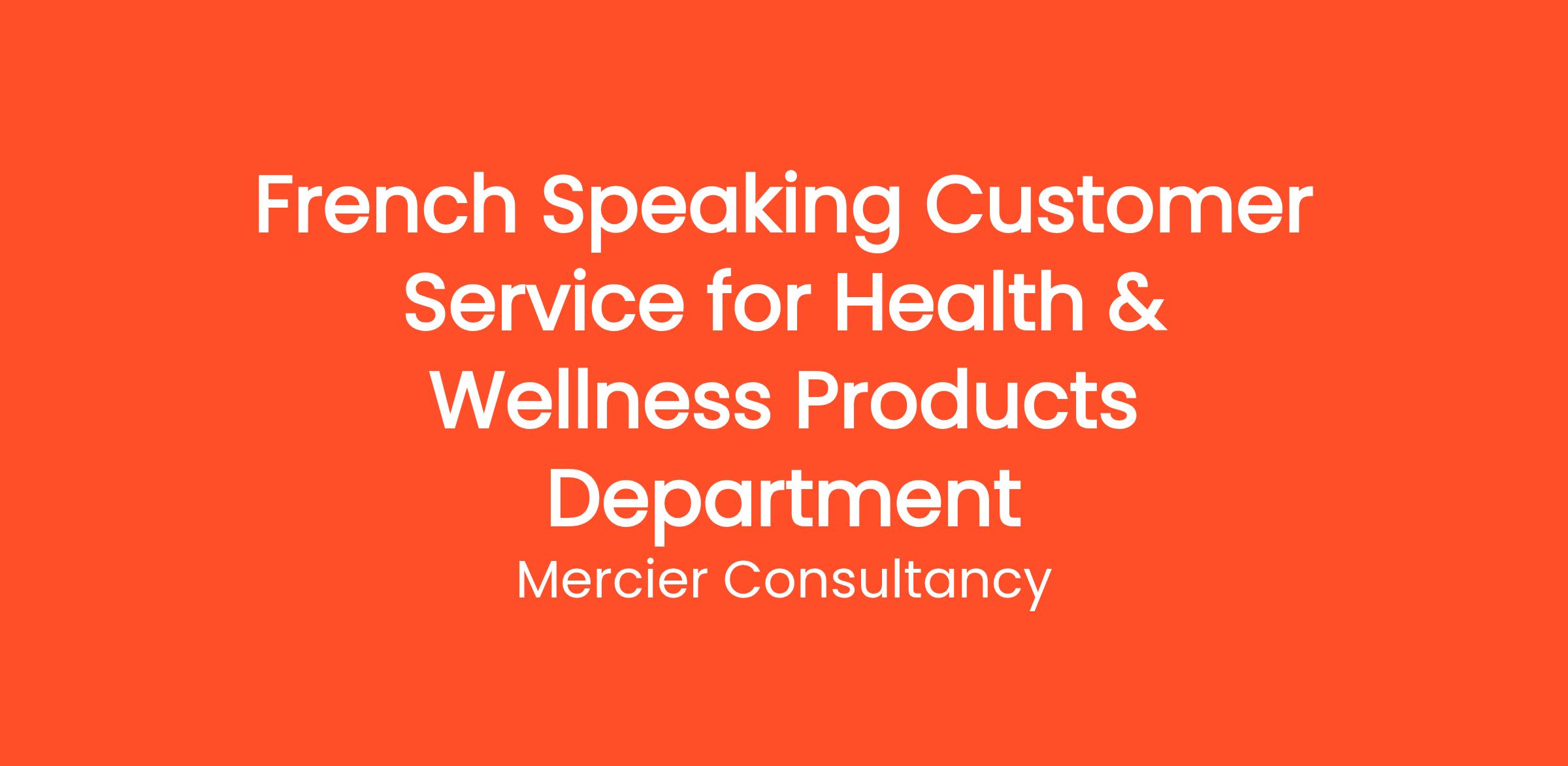 Mercier Consultancy is looking for a dedicated French Speaking Customer Service Representative to join our Client's Health & Wellness Products Department. In this junior level role, you will be instrumental in providing exceptional support to our French-speaking customers, assisting them with inquiries regarding our health and wellness products.