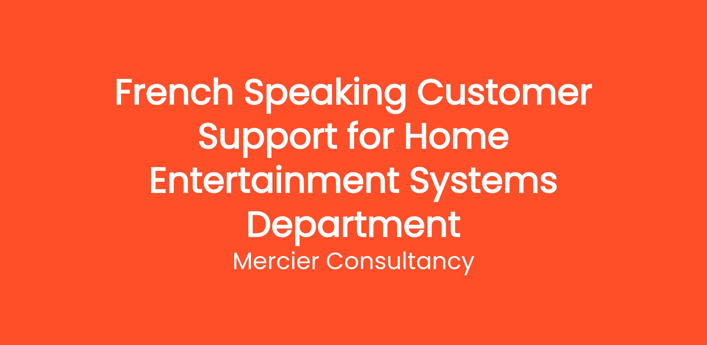 Mercier Consultancy is thrilled to announce an opening for a French Speaking Customer Support Representative for our Client's Home Entertainment Systems Department! In this key Junior role, you will serve as the primary point of contact for our French-speaking customers, assisting them with inquiries related to their home entertainment systems. Your fluency in French will be essential in providing exceptional customer service and ensuring our clients' satisfaction.