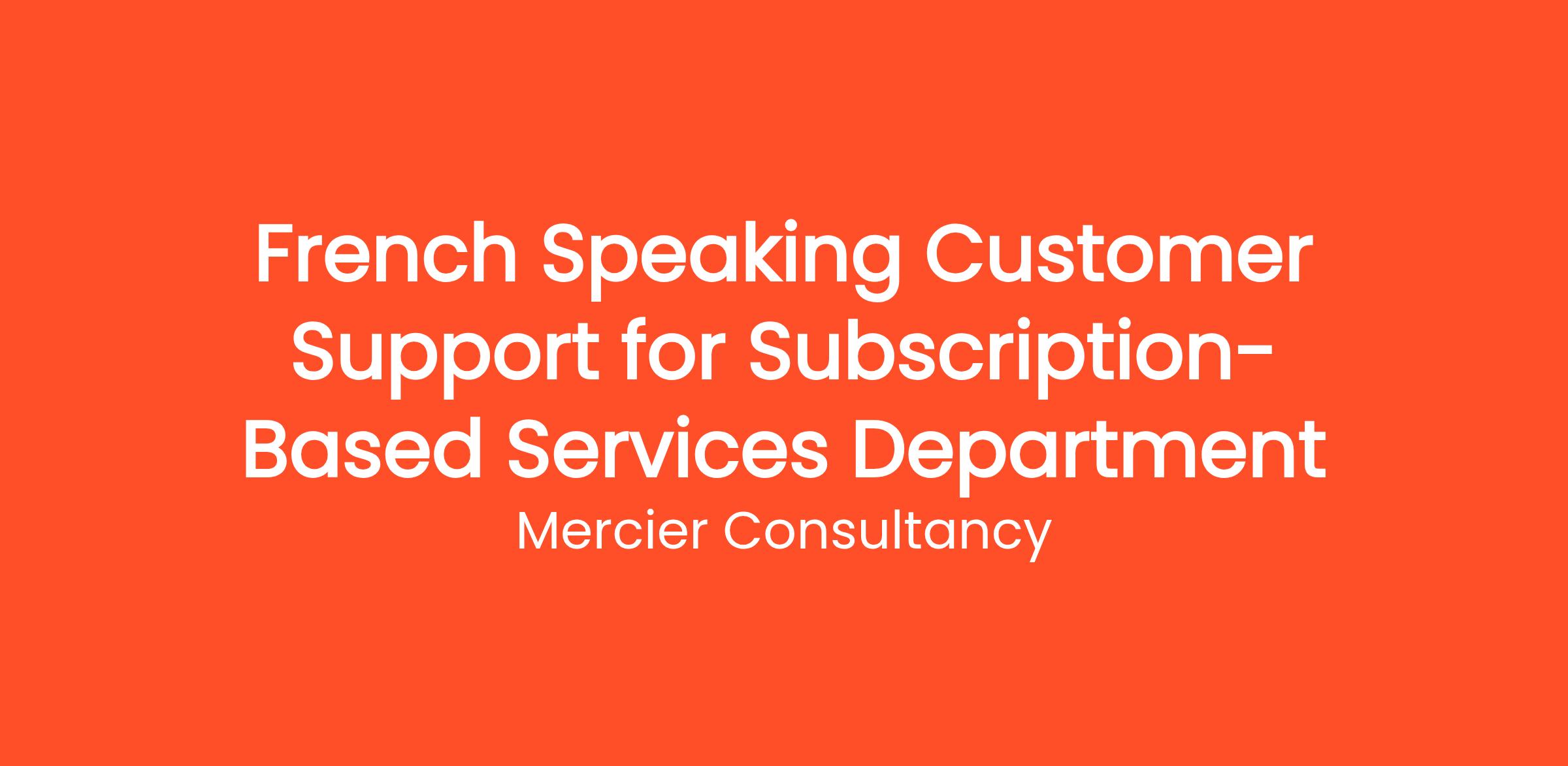 Mercier Consultancy is thrilled to announce an opening for a French Speaking Customer Support Representative in our Subscription-Based Services Department for one of our clients! In this key entry level role, you will serve as the primary point of contact for our French-speaking customers, providing them with exceptional support and guidance as they navigate our subscription services. Your expertise in the French language will play a crucial role in enhancing the customer experience.