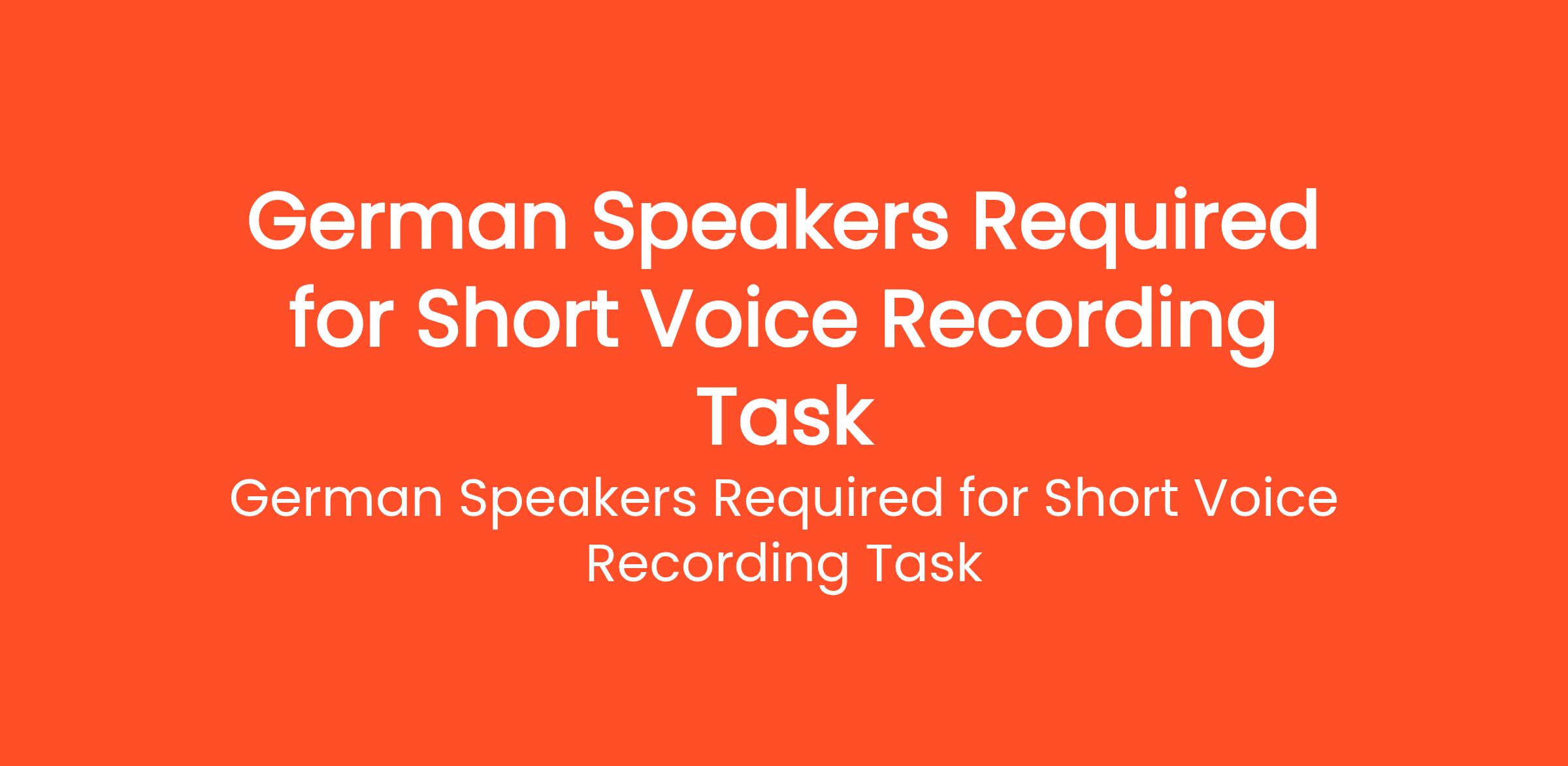 German Speakers Required for Short Voice Recording Task We need 100 Females and 100 Males Speakers for this project. We are recruiting additional freelancers for a German voice data project. The assignment is to record 725 short German sentences using our provided recording application... (Budget: $5 - $10 USD, Jobs: Audio Editing, Audio Production, Audio Services, English (US) Translator, German Translator, German Tutoring, Voice Acting, Voice Artist, Voice Over, Voice Talent)