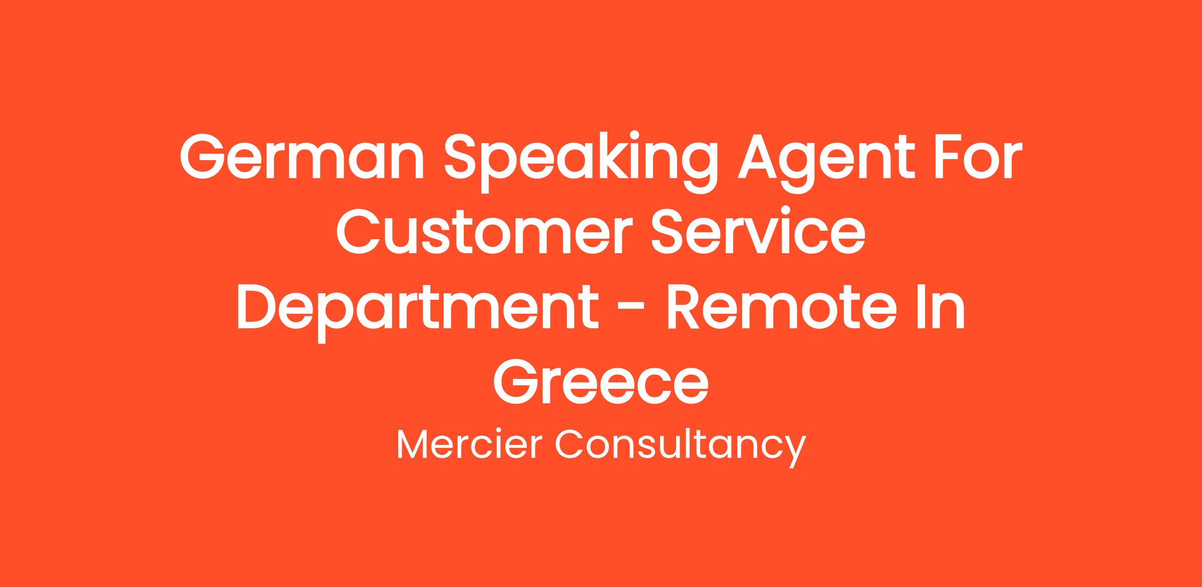 Mercier Consultancy is excited to offer a position for a German Speaking Agent in our Customer Service Department, with the opportunity to work remotely from Greece! In this role, you will be responsible for providing top-notch support to our German-speaking clients, addressing their inquiries, and resolving their concerns swiftly and efficiently.