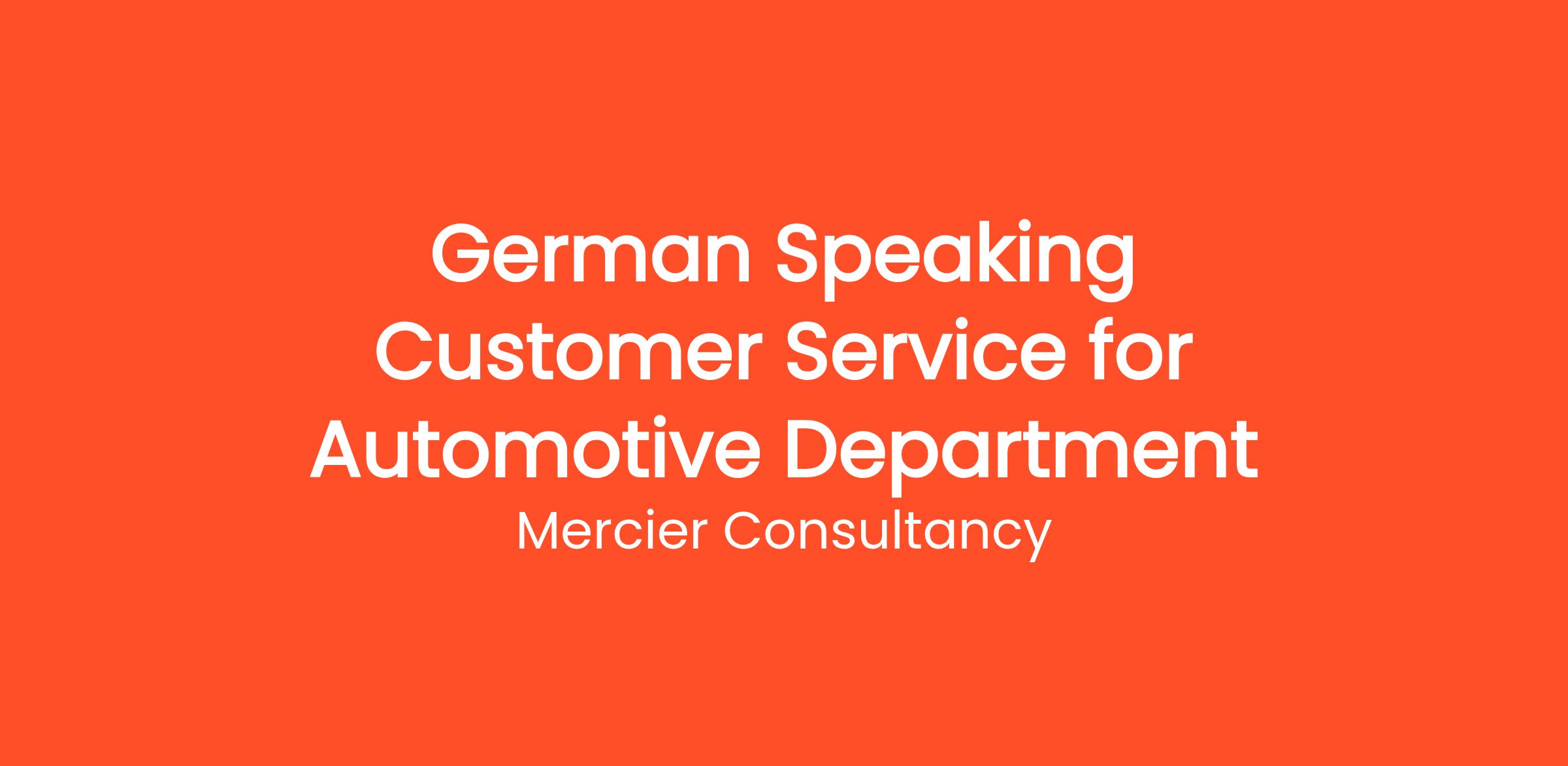 Mercier Consultancy is on the lookout for a dedicated German Speaking Customer Service Representative to join our Automotive Department. In this integral role, you will provide exceptional support to our German-speaking clients, helping them with inquiries related to our automotive services and ensuring a seamless customer experience.