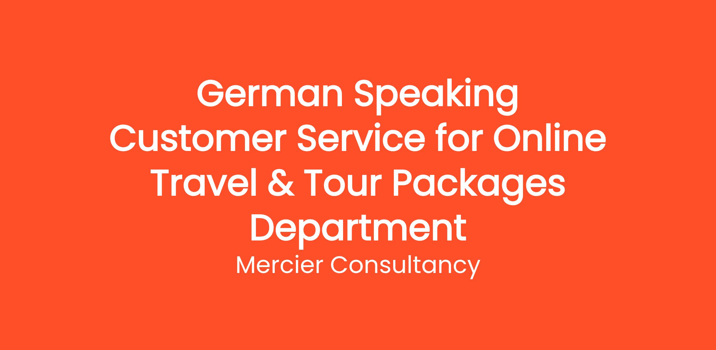 Mercier Consultancy is looking for a proactive German Speaking Customer Service Representative to join our Online Travel & Tour Packages Department for one of our clients. In this exciting Entry Level position, you will play a crucial role in providing outstanding support to our German-speaking clients as they plan and book their travel experiences with us.