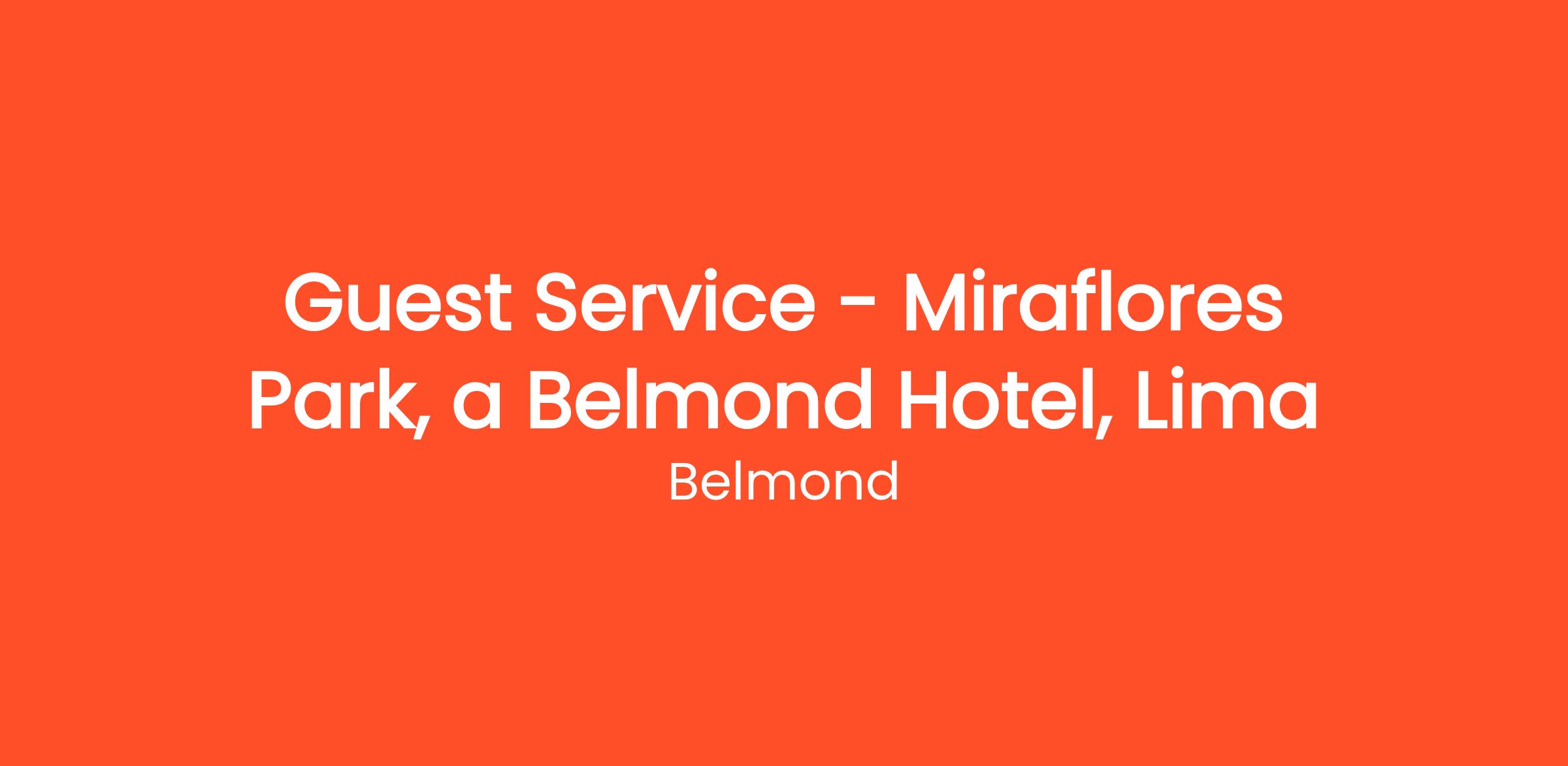 Miraflores Park, a Belmond Hotel, Lima, se enorgullece de formar parte de LVMH y de la colección global de icónicos hoteles, trenes y cruceros fluviales de Belmond, encargados de crear experiencias excepcionales en todo el mundo. Cuando se une a una de nuestras propiedades, se une a una familia global de hoteles ricos en historia y destinos impresionantes, donde nuestros empleados son el corazón de la experiencia Belmond.
