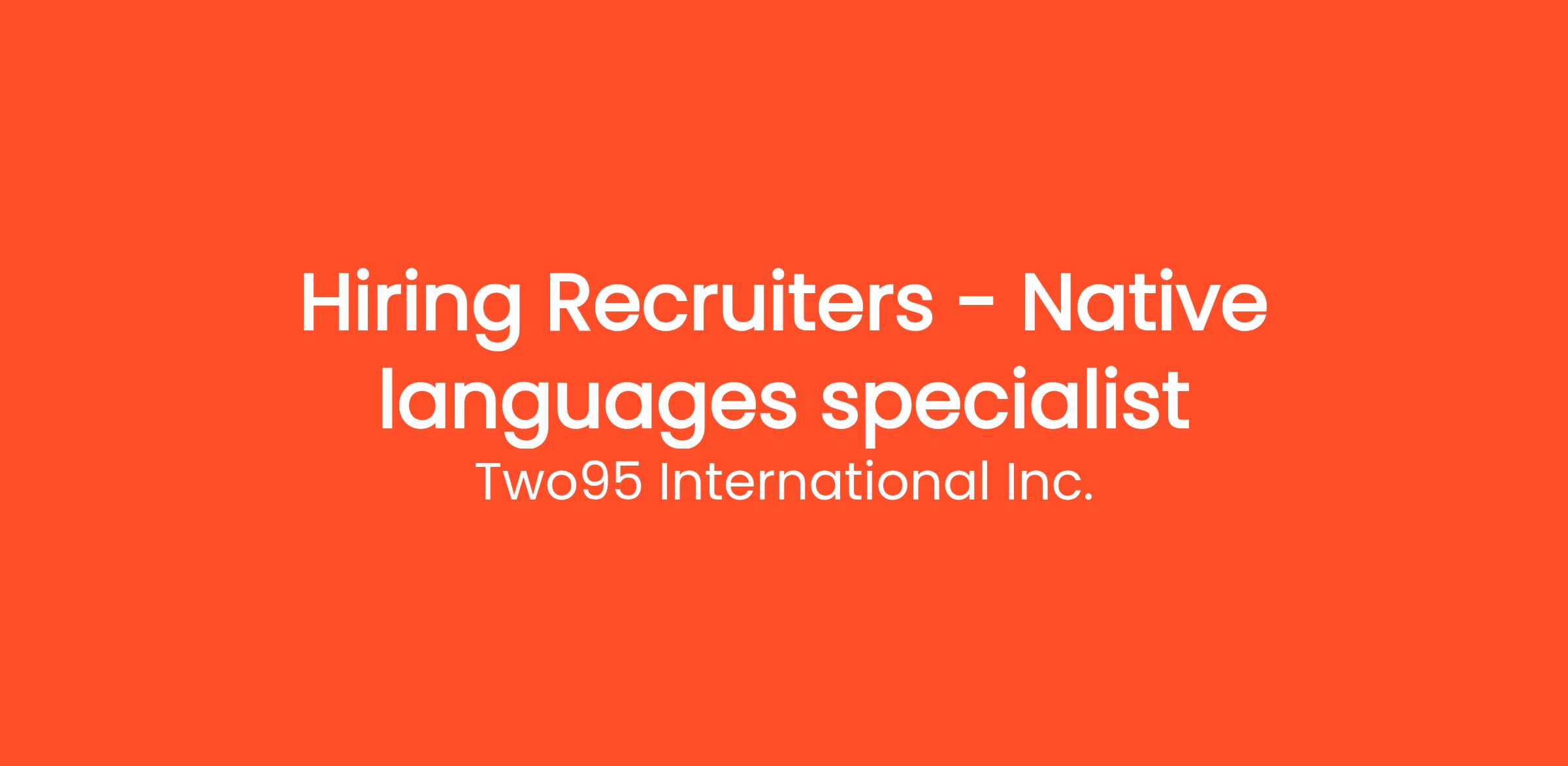 Two95 International . is looking for experienced recruiters who specialize in native languages to join our team. We are now looking for motivated recruiters who can bring their expertise and help us find the best candidates for our clients.