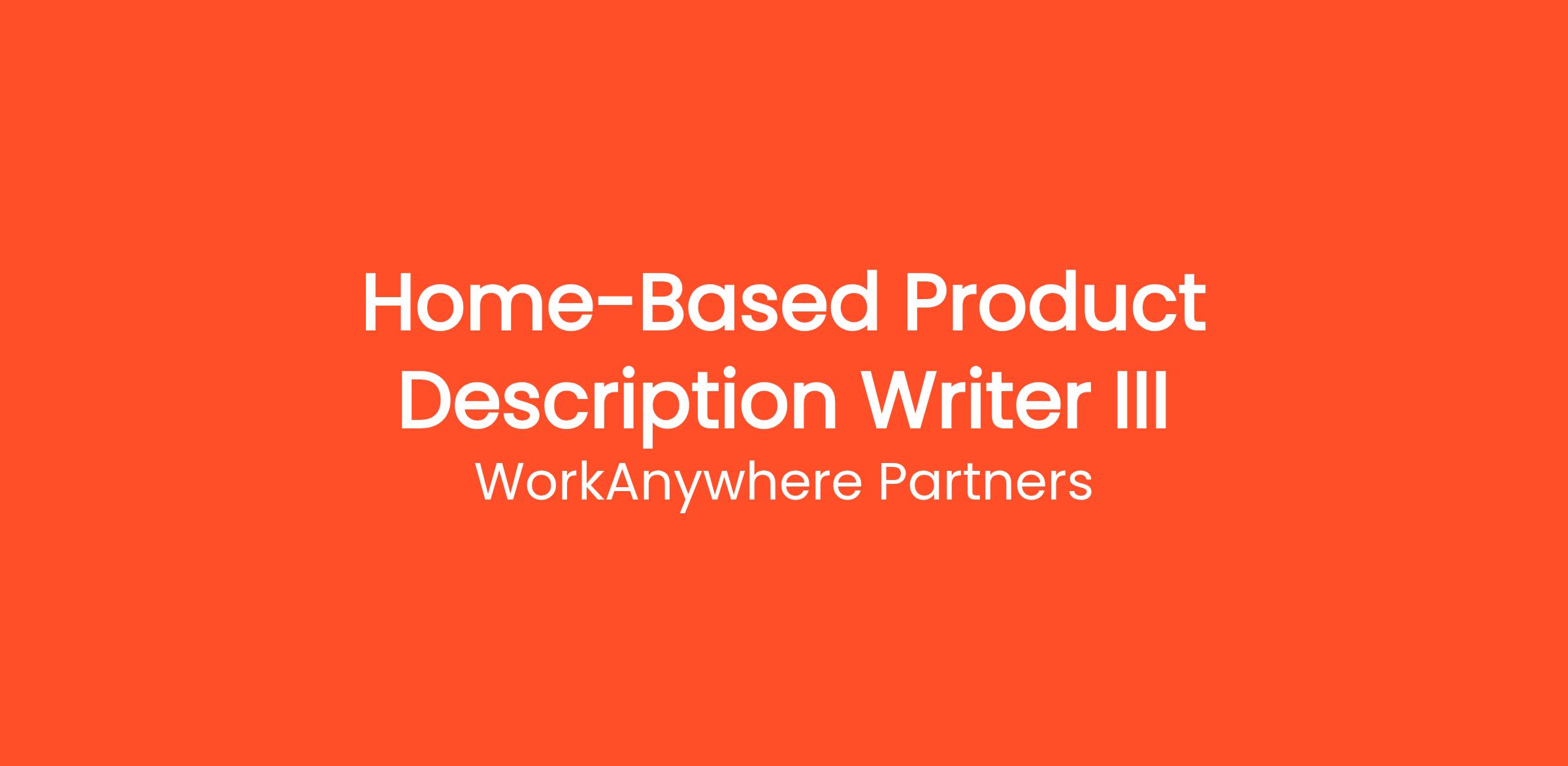 Thousands of people are already working from home as a Home-Based Product Description Writer III with WorkAnywhere Partners. Earn money writing articles, blogs, and product descriptions from home. Flexible hours, multiple niches available, weekly pay. This work-from-home opportunity requires no commute, no degree, and no special prior experience. Get started on your own terms — choose your own hours and work as many or as few hours per week as you need. Payouts are processed regularly with multiple withdrawal options so you always get paid on time.