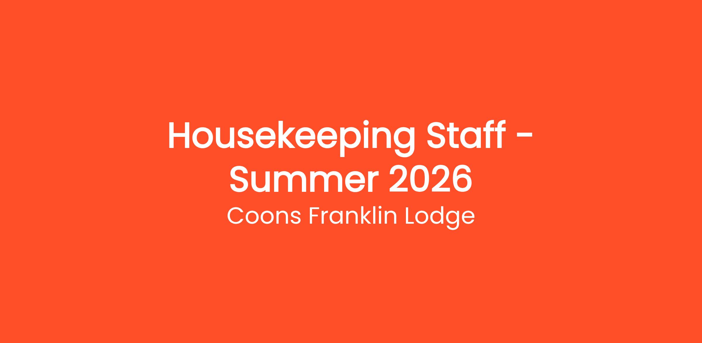 Coons Franklin Lodge is currently seeking enthusiastic and reliable Housekeeping Staff for the Summer of 2026. As a member of our housekeeping team, you will be responsible for maintaining the cleanliness and comfort of our cabins and public areas, ensuring that our guests enjoy a pleasant and welcoming environment during their stay.