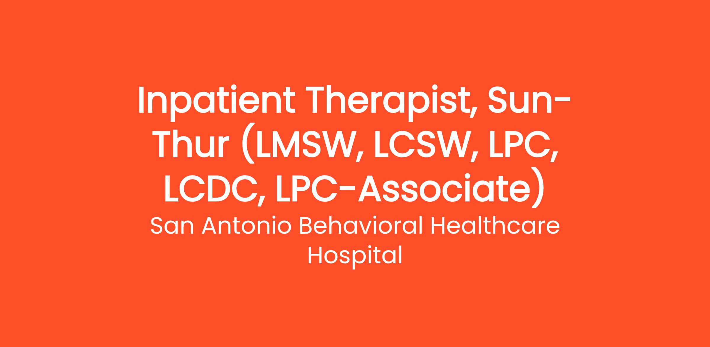 Inpatient Therapist, Sun-Thur (LMSW, LCSW, LPC, LCDC, LPC-Associate)