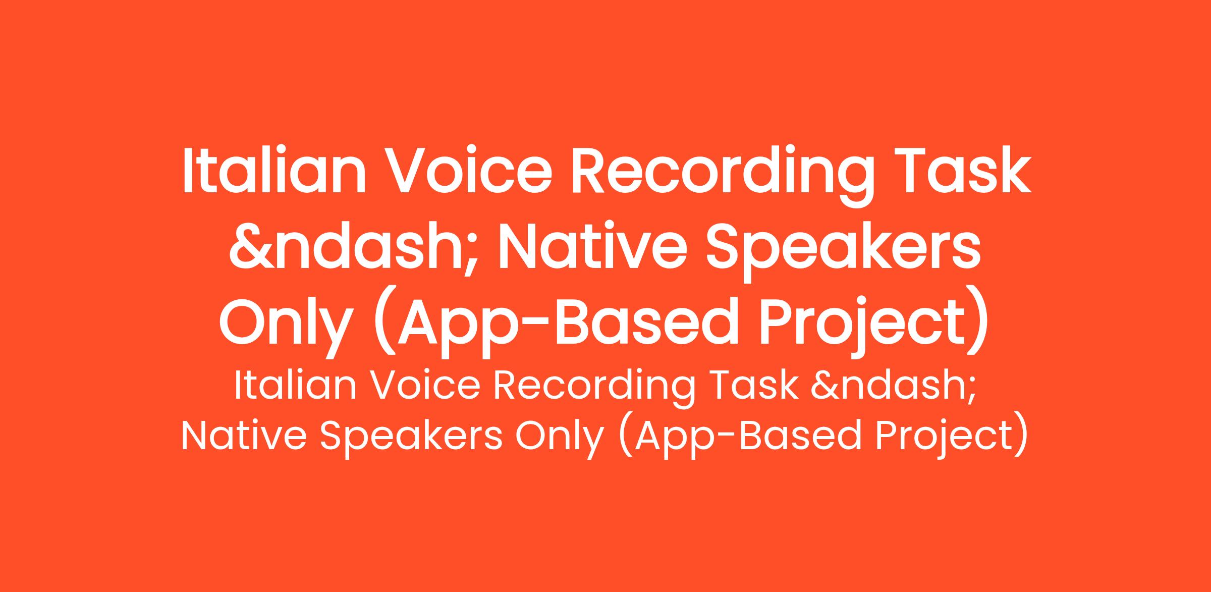 Italian Voice Recording Task – Native Speakers Only (App-Based Project) We are expanding our voice data project and are seeking native Italian speakers to participate in a short sentence recording task using our custom recording application... (Budget: $5 - $10 USD, Jobs: Audio Editing, Audio Production, Audio Services, Italian Translator, Mobile App Development, Voice Acting, Voice Assistance Devices, Voice Over, Voice Synthesis, Voice Talent)