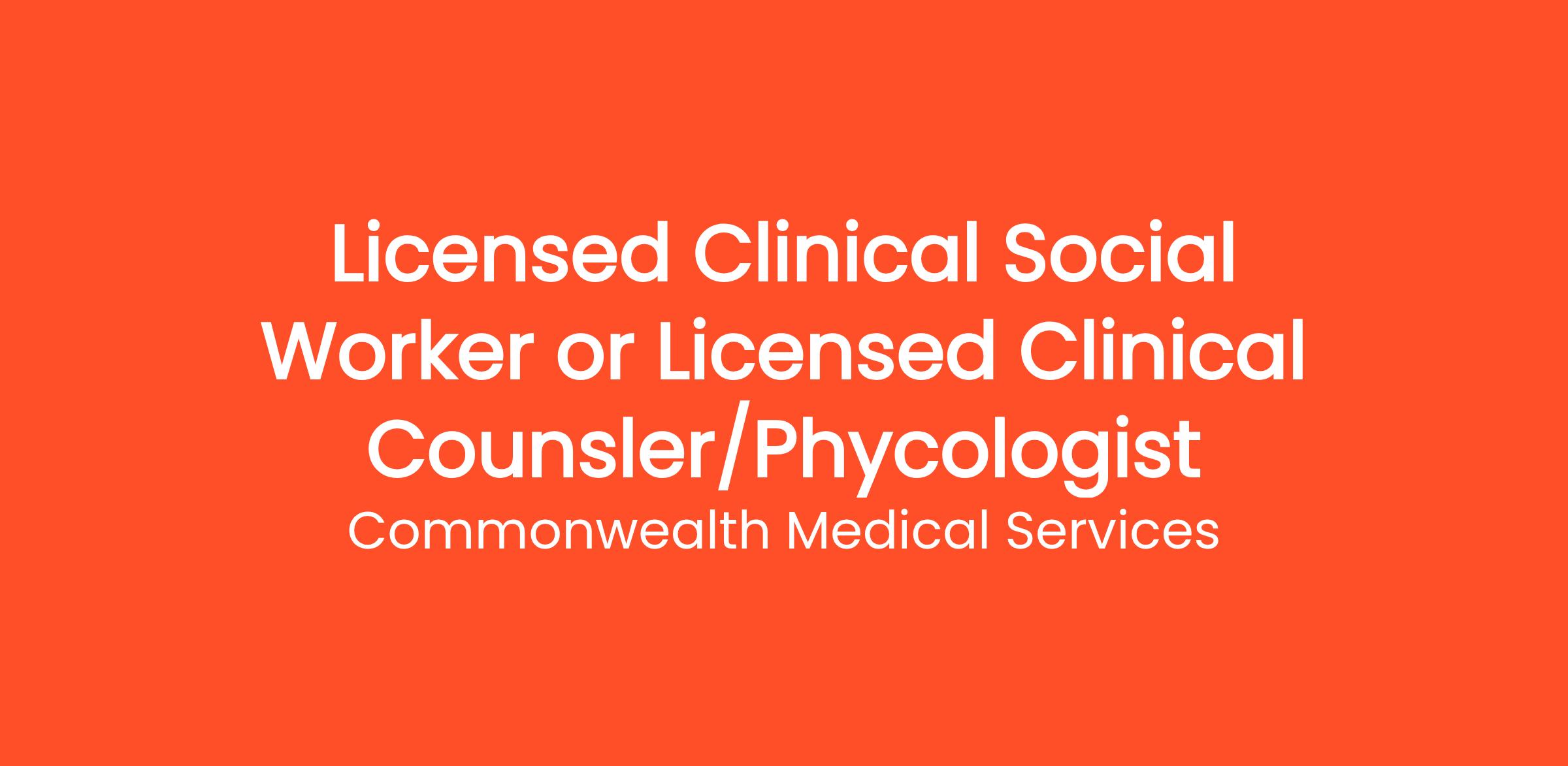 Commonwealth Medical Services is seeking a compassionate and dedicated Licensed Clinical Social Worker (LCSW) or Licensed Clinical Counselor/Psychologist to join our esteemed team in the Hospital & Health Care industry. This role is vital to our mission of providing comprehensive mental health services to our diverse patient population. As a key member of our healthcare team, you will engage with clients to assess their mental health needs, develop personalized treatment plans, and implement evidence-based interventions to promote their emotional and psychological well-being. You will work collaboratively with physicians, nurses, and other healthcare professionals to ensure a holistic approach to patient care. Your ability to foster strong therapeutic relationships with clients will be essential in helping them navigate challenges such as anxiety, depression, trauma, and family issues. We offer a supportive work environment where you can grow your skills and make a meaningful impact in the lives of others. If you are passionate about advocating for mental health and are looking for a fulfilling career, we invite you to apply for this rewarding opportunity at Commonwealth Medical Services.