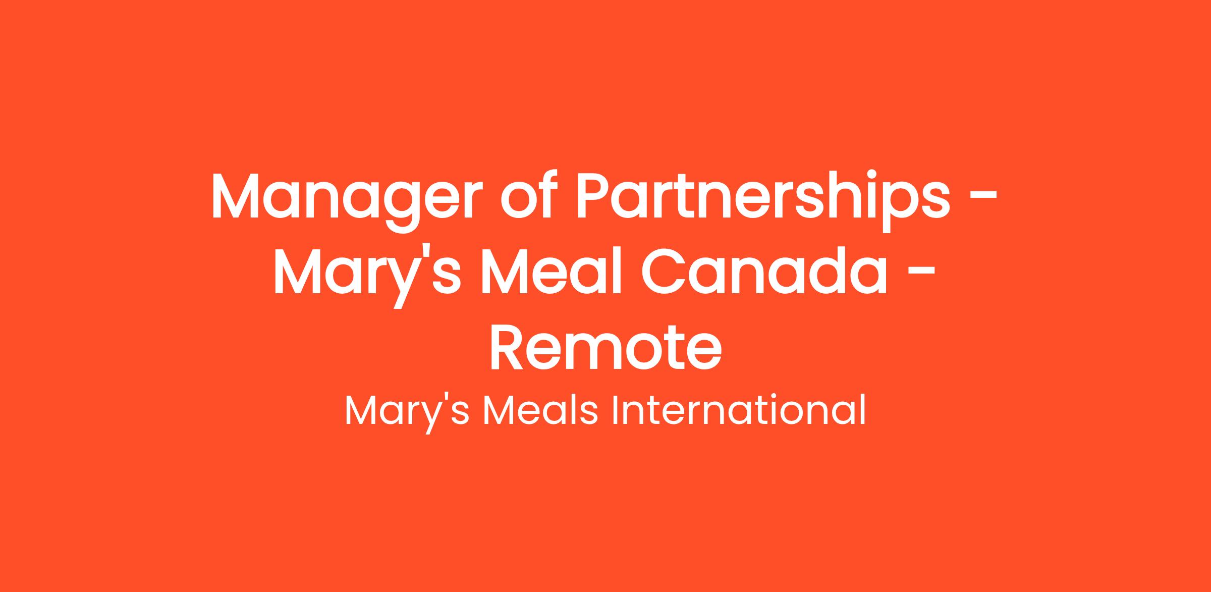 Mary’s Meals Canada (MMC) are recruiting for a Manager of Partnerships, this is a remote role with a preference for candidates located in the GTA or Calgary, where volunteer activity is most concentrated.