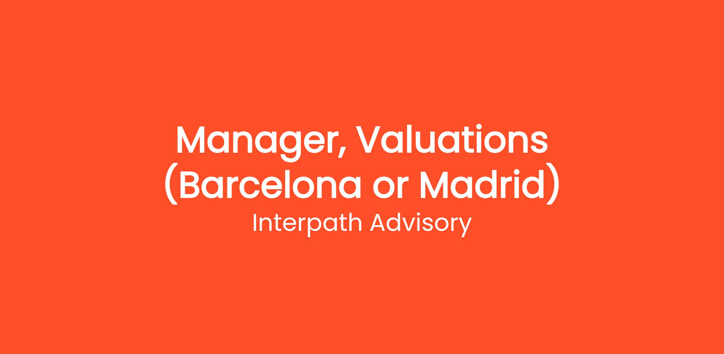 Valuations is an established service line at Interpath and we offer exciting career opportunities across Europe. We are currently recruiting for a Manager to join our Valuations team in Spain that will be based either in our Barcelona or Madrid offices. As a Manager, you will gain a broad range of experience.