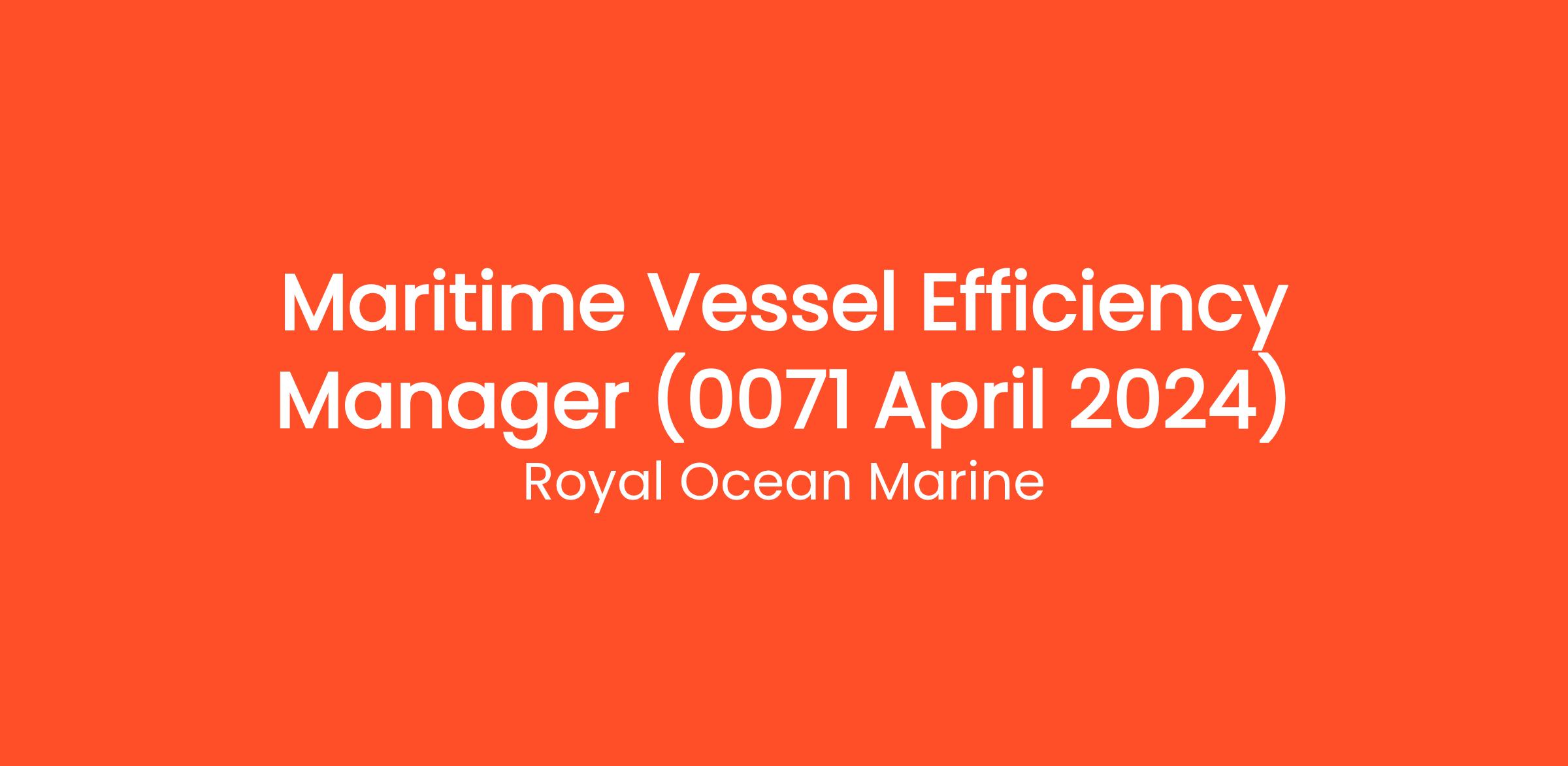 Royal Ocean Marine is seeking a highly skilled and motivated Maritime Vessel Efficiency Manager to join our client's team. As the Maritime Vessel Efficiency Manager, you will be responsible for ensuring the optimal performance of our fleet by implementing efficient operational practices and identifying opportunities for improvement.